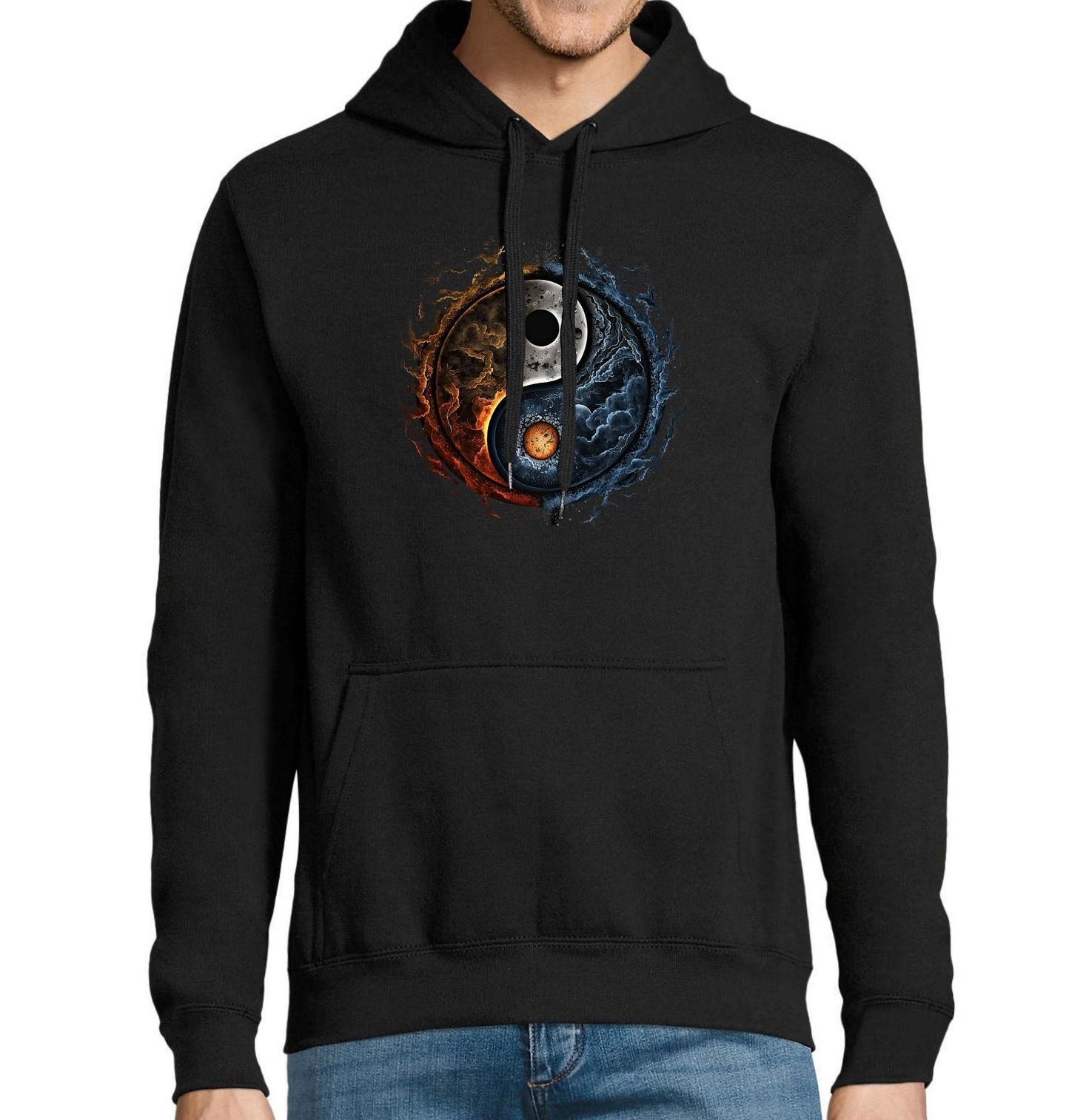 Pánská mikina Oheň a Led Jin a Jang. Originální design jin a jang zobrazený jako střet dvou živlů – ohně a ledu. Symbol jin a jang představuje rovnováhu mezi protiklady, světlem a tmou, teplem a chladem, chaosem a klidem. Tento motiv je ideální pro všechny, kteří milují duchovní symboliku, energii vesmíru a harmonii života.