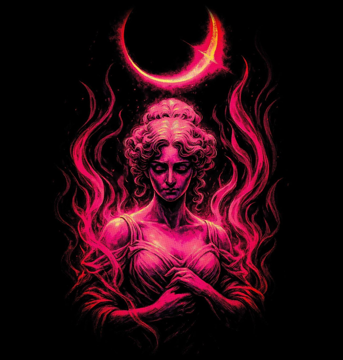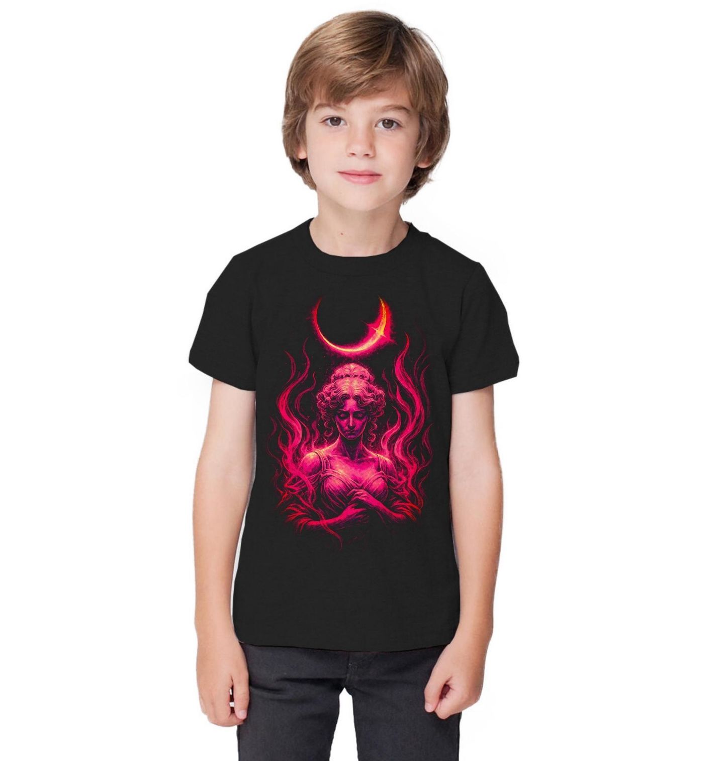 Dětské tričko Ohnivá Bohyně pod Krvavým Měsícem. Tajemná a silná ženská postava zahalená do plamenů pod zářícím srpkem měsíce vytváří hypnotizující motiv plný energie a emocí. Tento design působí jako temná bohyně, mystická bytost nebo symbol ženské síly, vášně a vnitřního ohně. Postava zde nepředstavuje konkrétní historickou osobu – jde o stylizovanou, fantazijní bytost, která může symbolizovat bohyni, čarodějku nebo zosobnění síly a transformace.