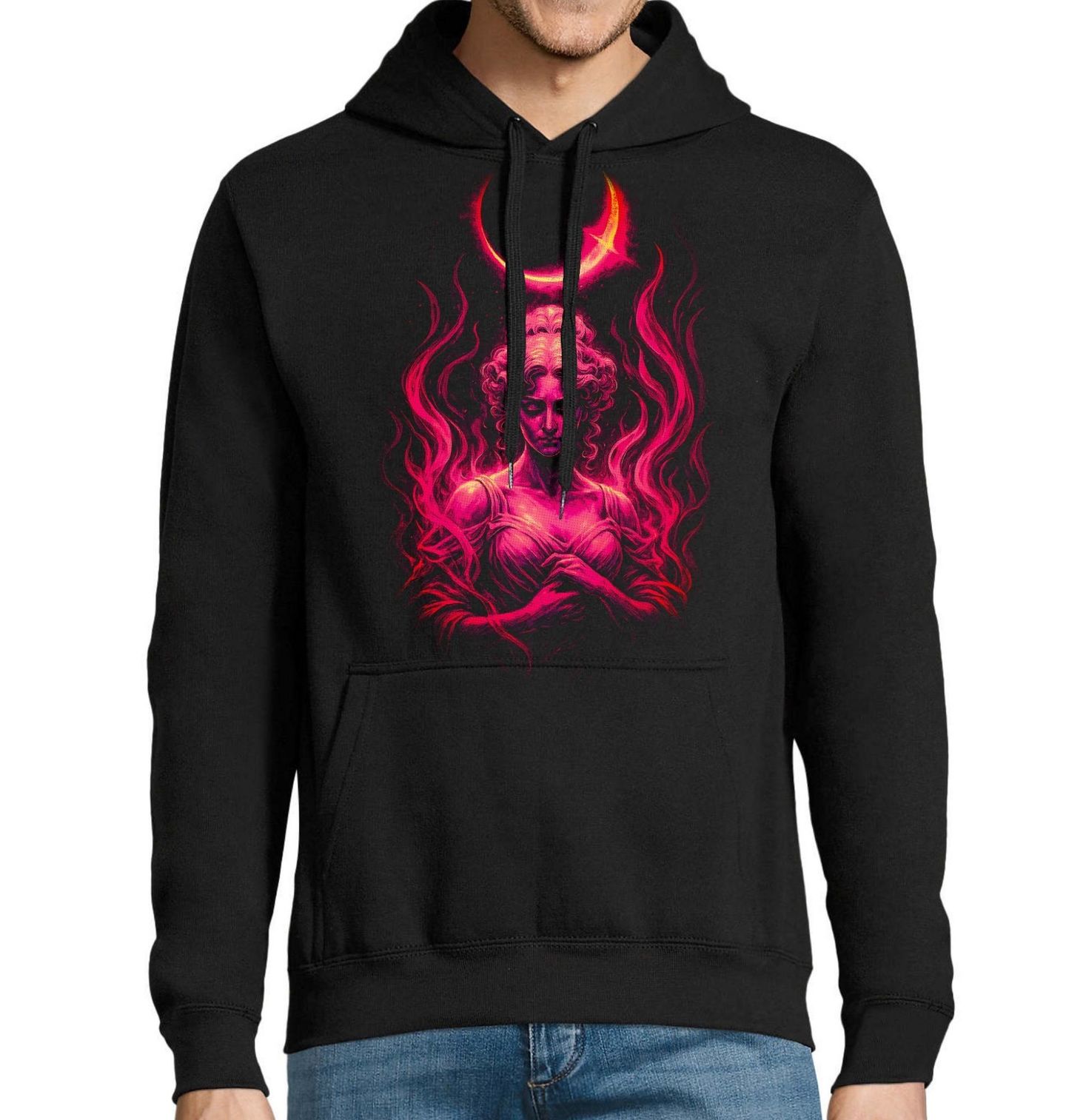 Pánská mikina Ohnivá Bohyně pod Krvavým Měsícem. Tajemná a silná ženská postava zahalená do plamenů pod zářícím srpkem měsíce vytváří hypnotizující motiv plný energie a emocí. Tento design působí jako temná bohyně, mystická bytost nebo symbol ženské síly, vášně a vnitřního ohně. Postava zde nepředstavuje konkrétní historickou osobu – jde o stylizovanou, fantazijní bytost, která může symbolizovat bohyni, čarodějku nebo zosobnění síly a transformace.