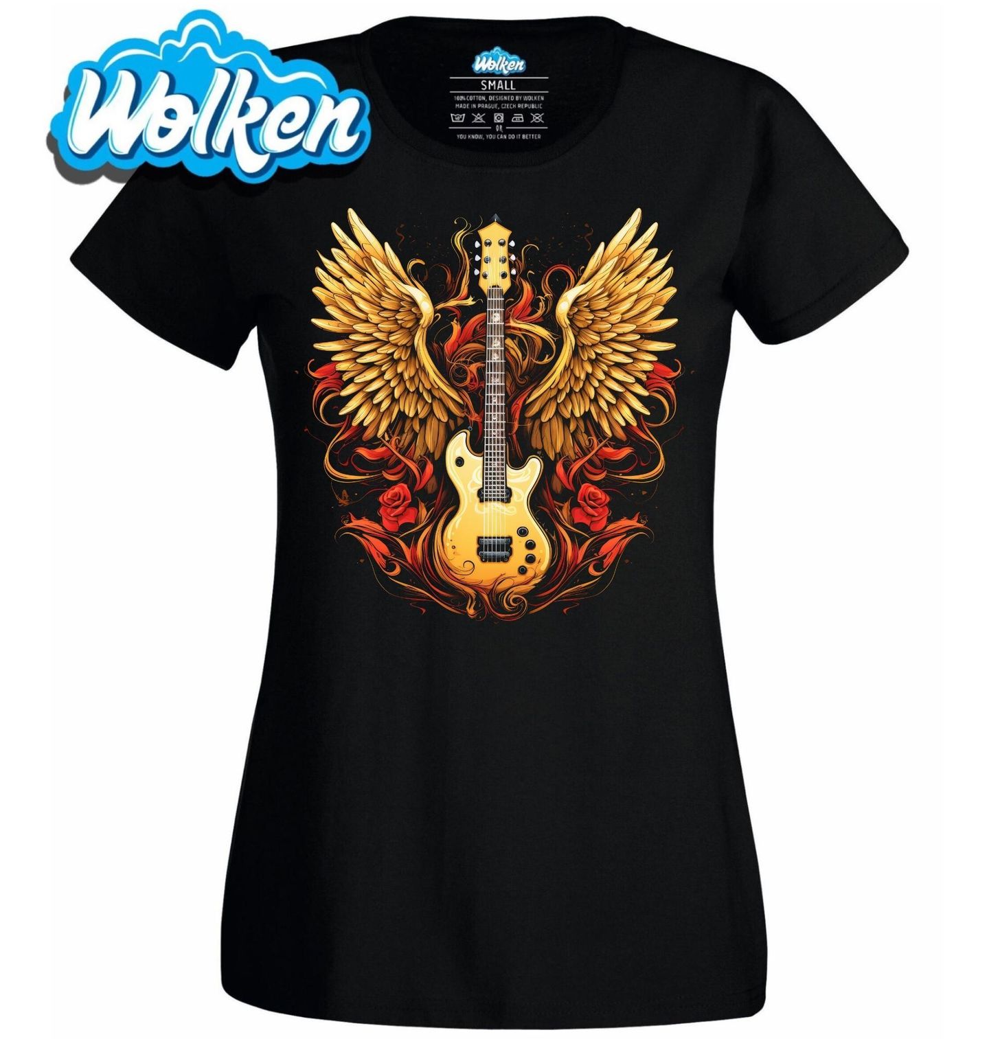 Dámské tričko Ohnivá Kytara s Křídly. Elektrická kytara a andělská křídla v ohnivém designu je poctou legendám rock and rollu i tvému vlastnímu stylu. Toto tričko je ideální pro milovníky rockové módy, hudební nadšence i fanoušky nezávislého vzhledu. Výrazný potisk s detailně propracovanou kytarou a zlatými křídly dává jasně najevo, že hudba je životní energie.