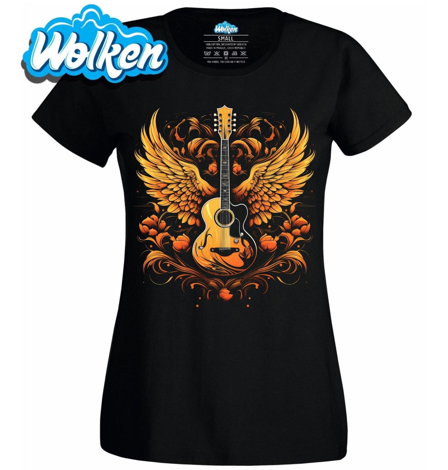 Dámské tričko Ohnivá kytara Svobody. Ikonický motiv pro všechny milovníky rocku, metalu a nespoutané energie – kytara, kterou obklopují mocná křídla a šlehající květiny. Symbol svobody, vášně a hudby, která hoří až do morku kostí. Skvělý dárek pro kytaristy, rockery nebo každého, kdo má v srdci hudbu.