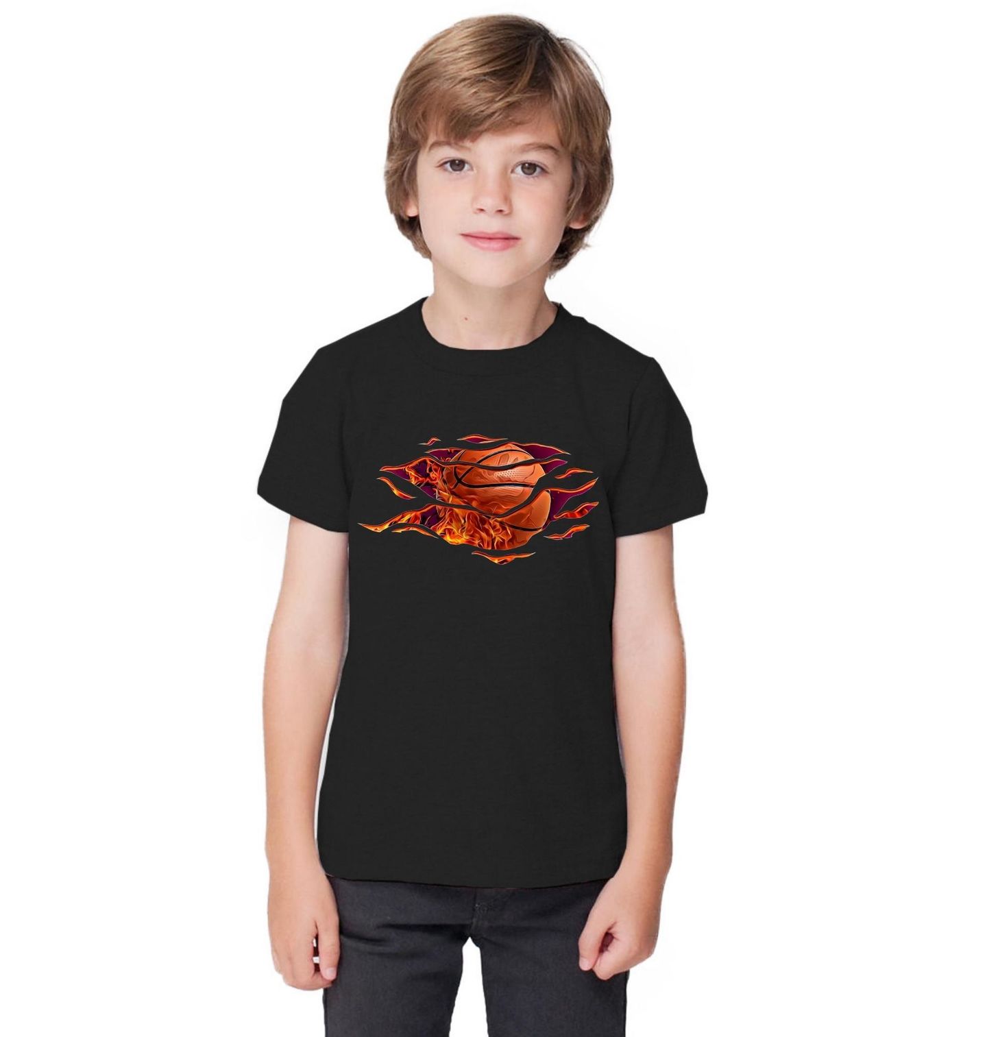 Dětské tričko Ohnivý Basketbalový Míč pod Kůží. Tento výrazný motiv zobrazuje, jako by se z látky prodíral rozpálený míč obklopený plameny. Basketbal je tady ukázaný jako dynamický a energický sport, kde míč doslova hoří vášní a tempem hry. Realistický ohnivý efekt a „roztržený“ vzhled dodávají designu dravost a sílu - ideální pro každého, kdo žije pro basketbal a chce to dát najevo stylově.