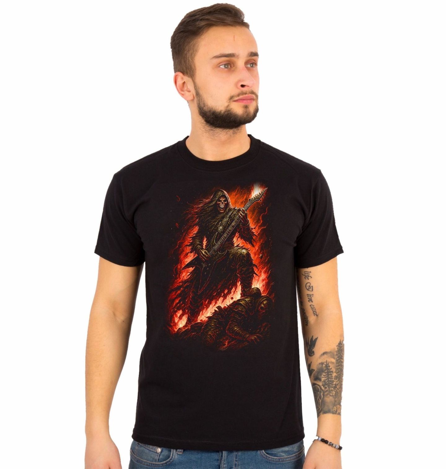 Pánské tričko Ohnivý Kostlivec Rock and Rollu. Explozivní motiv plný energie, který spojuje temnou estetiku s hudební vášní. Dominantní kostlivec v plamenech drtí struny své elektrické kytary a přináší nekompromisní rock and roll atmosféru. Dynamická kompozice, ohnivé efekty a agresivní výraz vytvářejí silný vizuální zážitek, který okamžitě zaujme. Ideální pro všechny milovníky tvrdé muziky, metalového stylu a výrazných designů.
