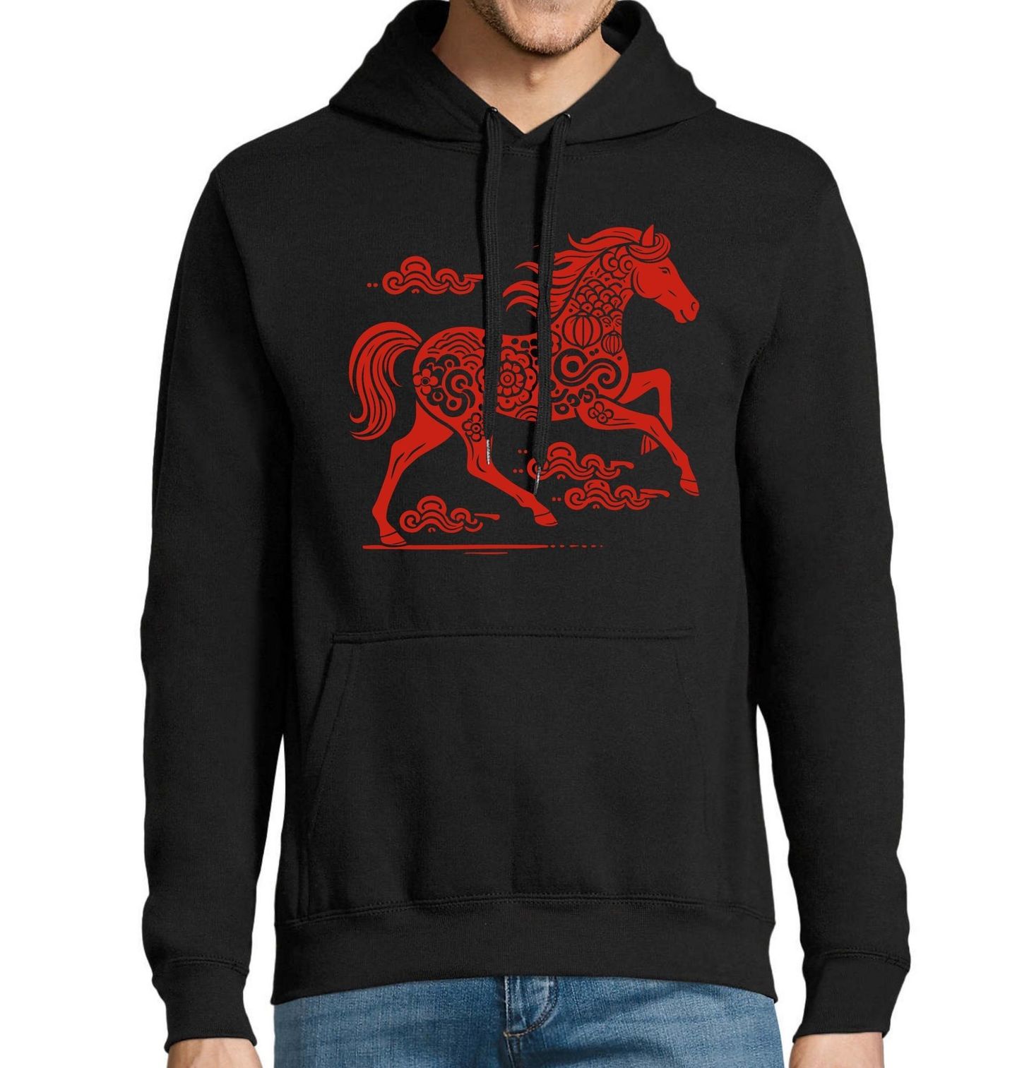 Pánská mikina Ohnivý Kůň Štěstí. Tento výrazný čínský motiv představuje kůň jako silný symbol energie, odvahy a svobody, který je úzce spojen s tradicí nový rok a s obdobím čínský rok ohnivého koně. Ohnivě červené zpracování odkazuje na prosperitu, štěstí a ochranu, zatímco dekorativní prvky vycházejí z tradiční čínské estetiky. Koně v čínské kultuře symbolizují pohyb vpřed, úspěch a vnitřní sílu.