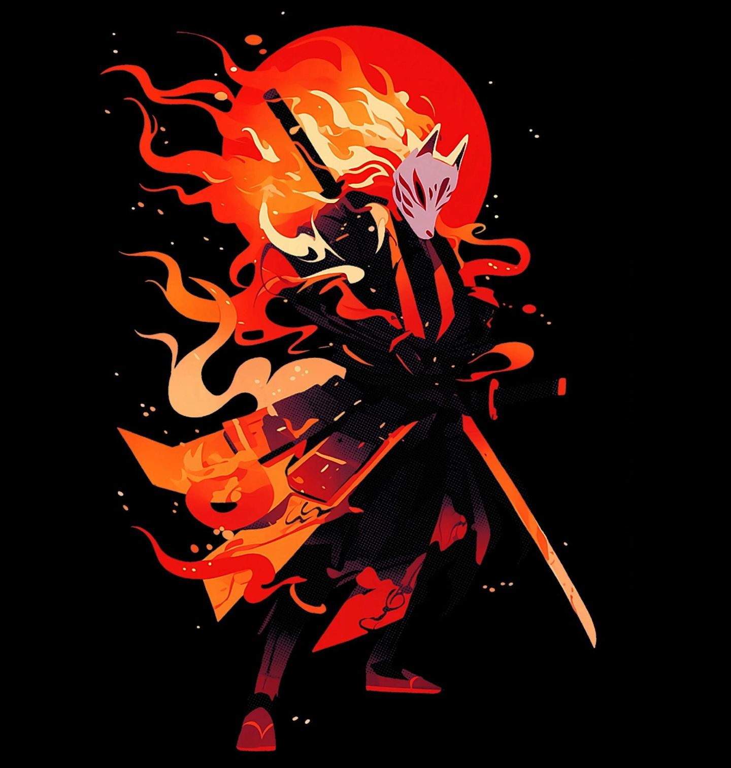 Pánské tričko Ohnivý Liščí duch Japonska Kitsune. Na ilustraci je zobrazena Kitsune (liška) – legendární liščí duch, který je symbolem magie, proměny a tajemství. Kitsune je zde vyobrazen jako temný samuraj zahalený v plamenech, s liščí maskou a katanou v rukou. V pozadí září červené slunce symbolizující Japonsko.