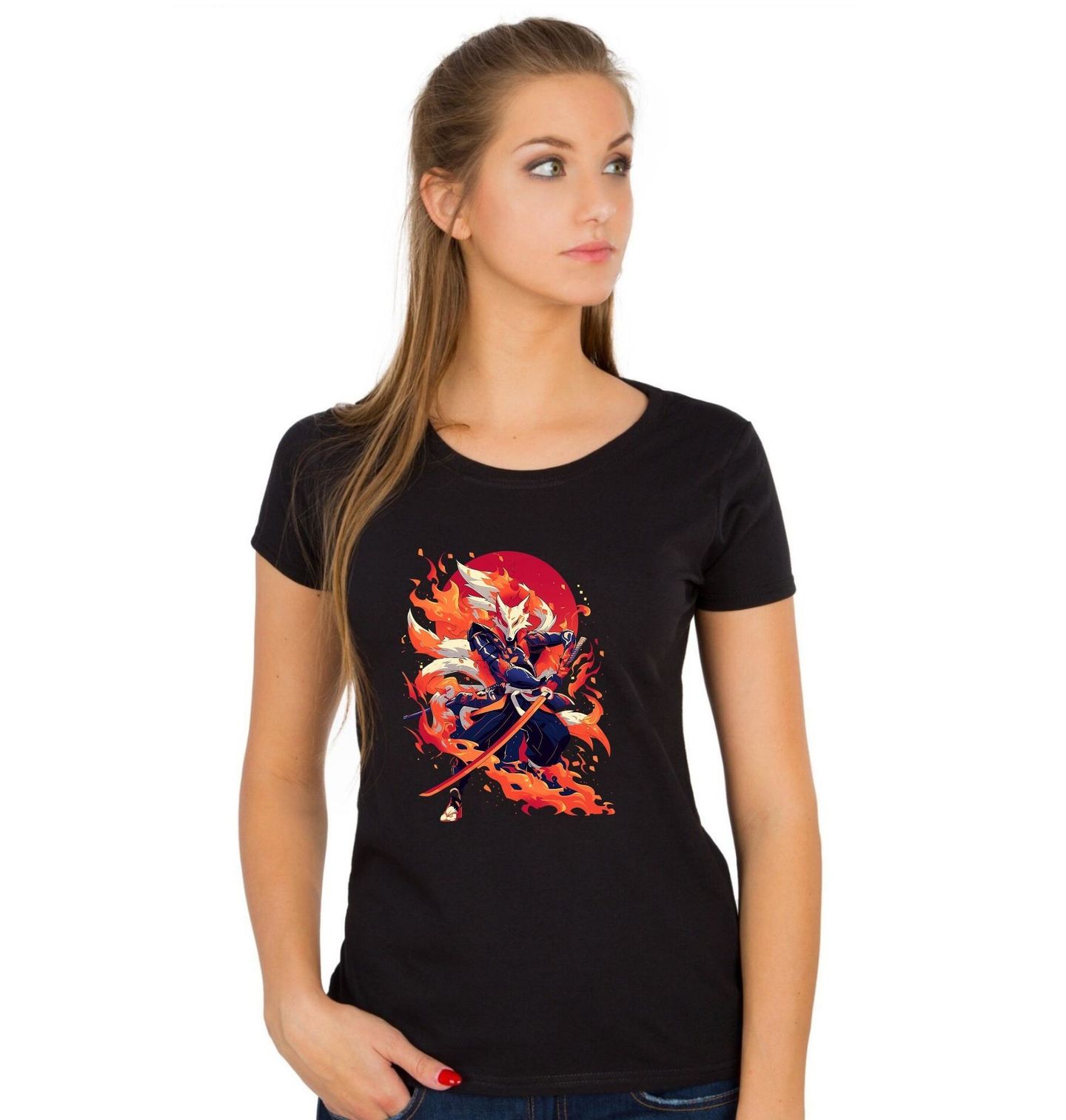 Dámské tričko Ohnivý Samuraj Devítiocasá Liška Kitsune. Tento jedinečný motiv je inspirovaný magickým světem Japonsko a jeho mytologií. Na ilustraci je zobrazen Kitsune – legendární liščí duch, který na sebe vzal podobu samuraje s katanou. Postava je zahalena v ohnivých plamenech a na tváři má tradiční liščí masku. Na pozadí září rudé slunce symbolizující Japonsko.
