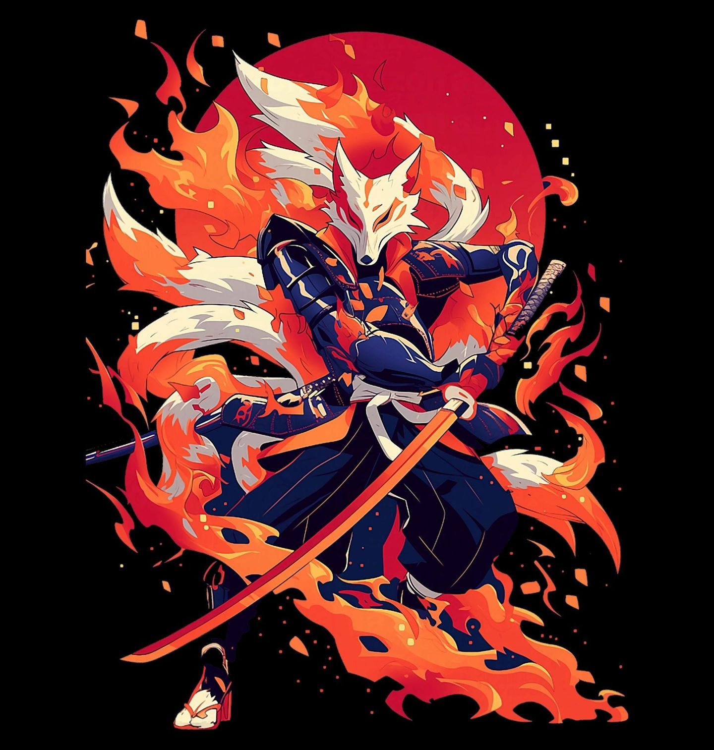 Pánská mikina Ohnivý Samuraj Devítiocasá Liška Kitsune. Tento jedinečný motiv je inspirovaný magickým světem Japonsko a jeho mytologií. Na ilustraci je zobrazen Kitsune – legendární liščí duch, který na sebe vzal podobu samuraje s katanou. Postava je zahalena v ohnivých plamenech a na tváři má tradiční liščí masku. Na pozadí září rudé slunce symbolizující Japonsko.