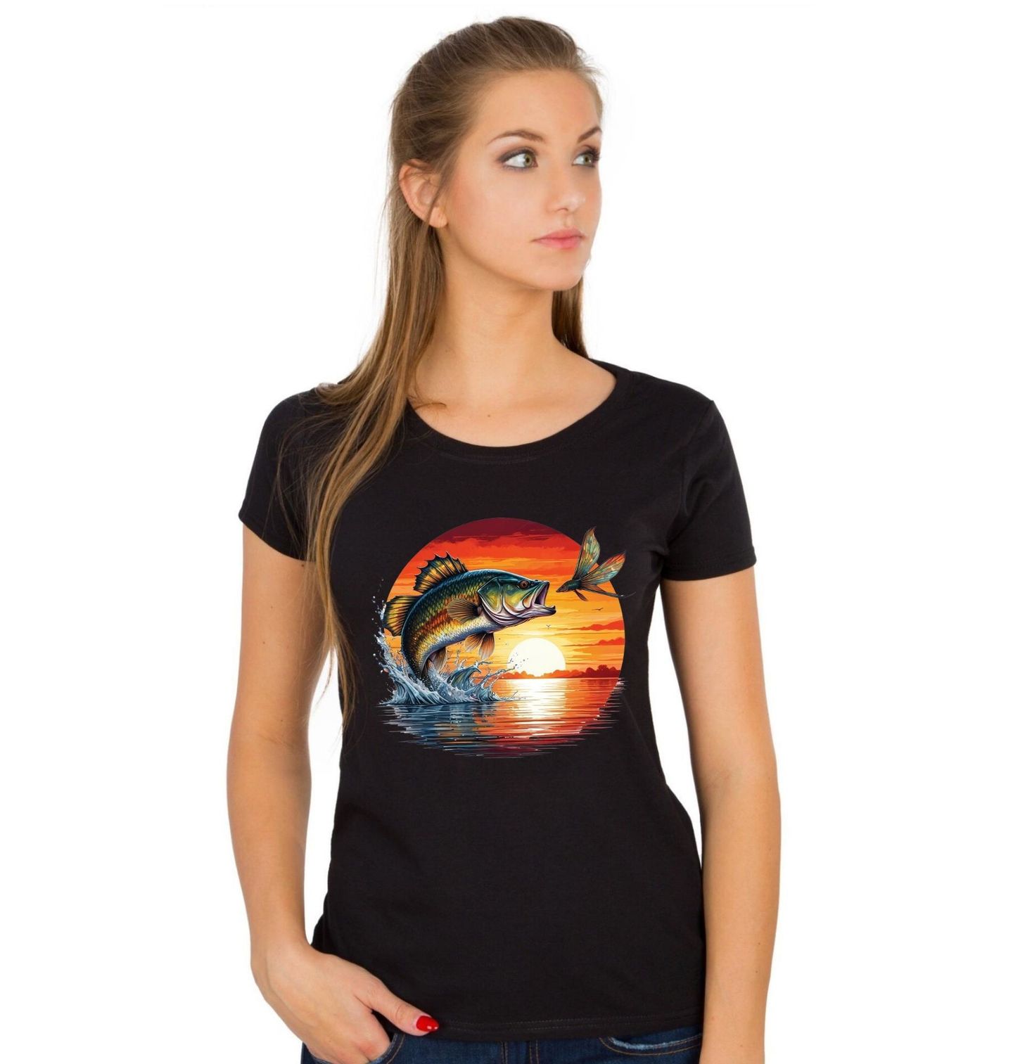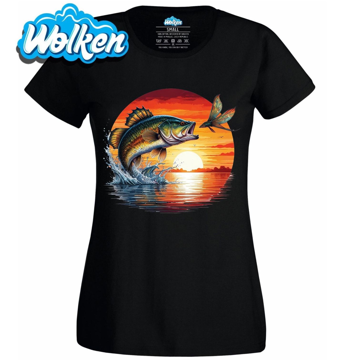 Dámské tričko Okoun a Létající Ryba. Dramatický výskok dravé ryby proti siluetě zapadajícího slunce a vzácný okamžik útoku na létající rybu – to je motiv, který vystihuje rybářský sen. Okoun (Largemouth bass) je symbolem moderního sportovního rybaření, a právě jeho výskok za kořistí přináší motivu energii i vášeň.