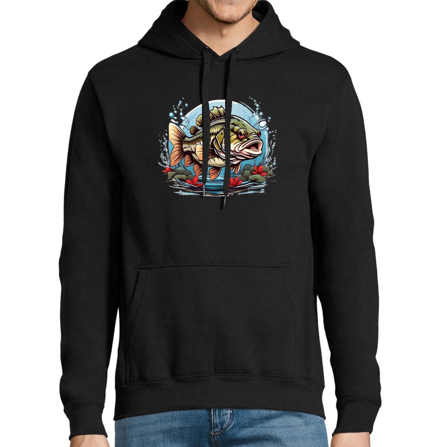 Pánská mikina Okoun mezi Lekníny. Originální tričko s barevným motivem ryby, konkrétně okouna velkého (Micropterus salmoides), který proráží vodní hladinu mezi červenými lekníny a stříkajícími kapkami. Skvělý doplněk pro každého rybáře, milovníka vody a rybaření.