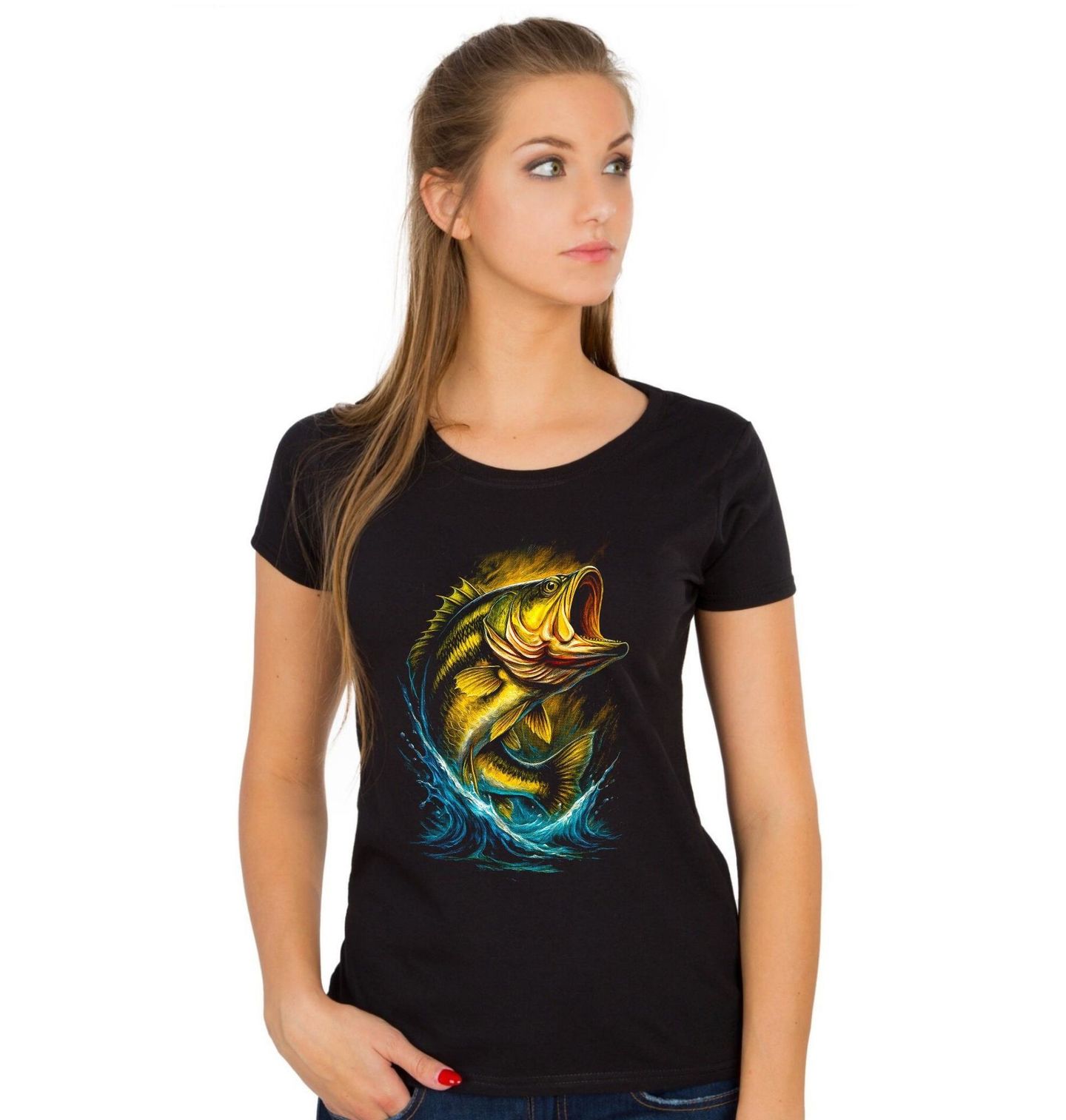 Dámské tričko Okoun obecný nad Hladinou. Výrazný motiv zachycuje okounovce (largemouth bass) v dramatickém okamžiku útoku, kdy se s otevřenou tlamou dere z vody. Tento ikonický dravec je symbolem akčního rybaření, rychlé reakce a surové síly, kterou miluje každý rybář. Okounovec patří mezi nejoblíbenější cíle sportovního rybolovu po celém světě a jeho explozivní záběr na hladině je nezapomenutelný zážitek.