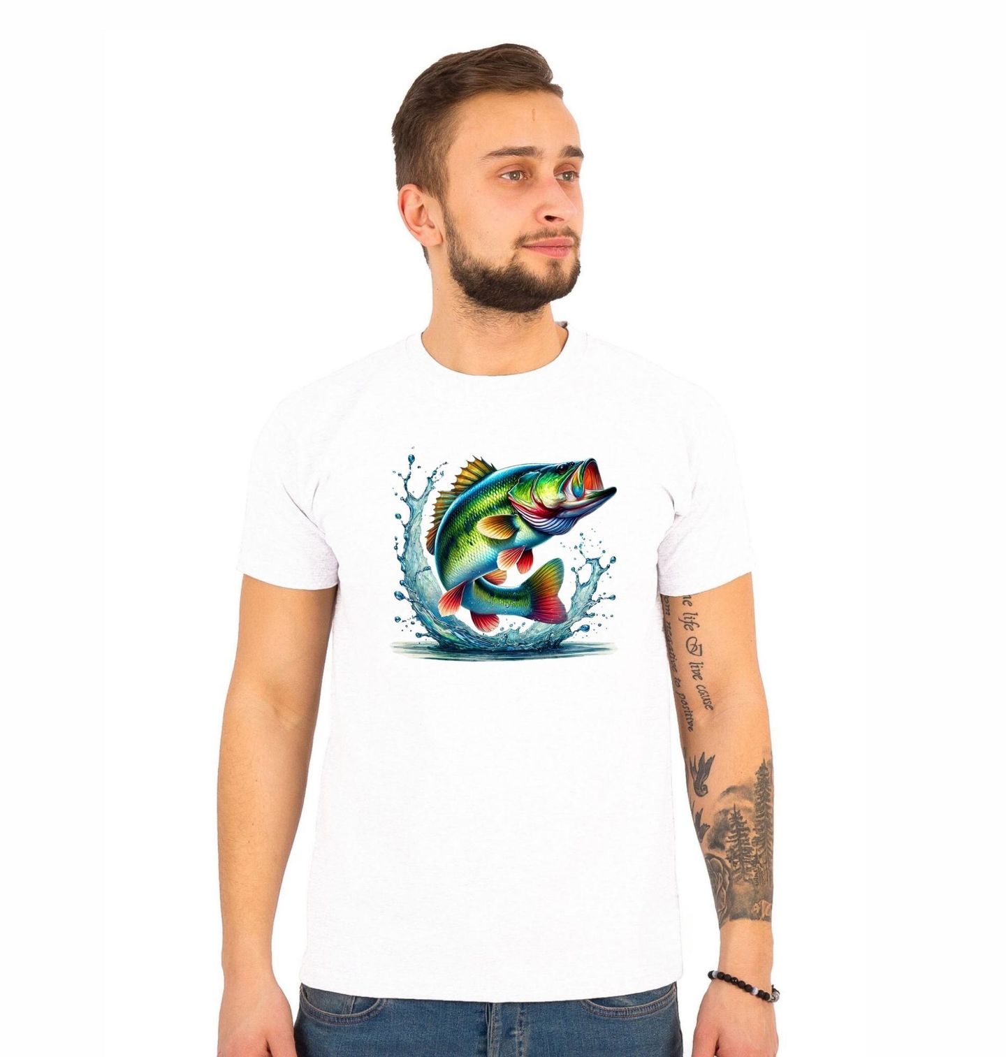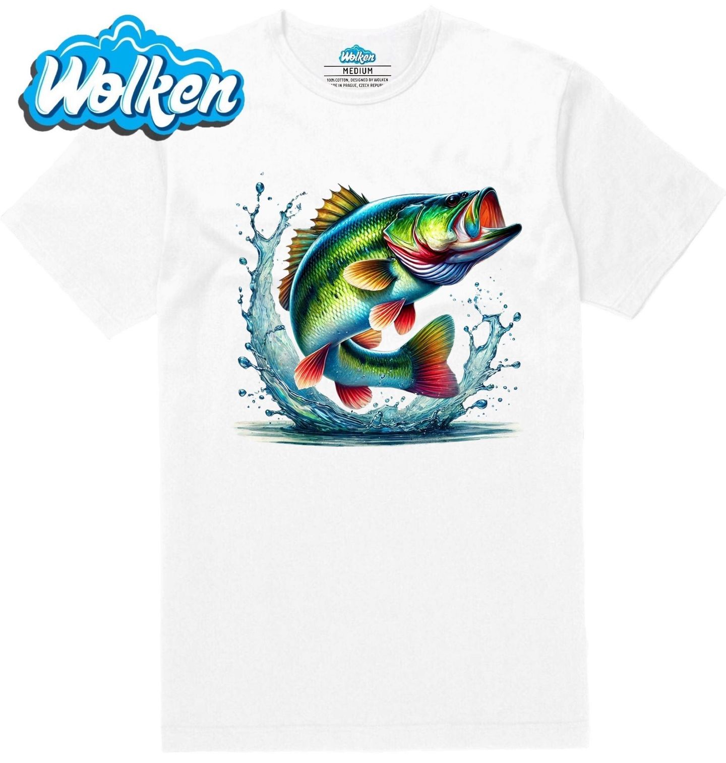 Pánské tričko Okoun ve Vodě. Stylizovaná ryba zachycená při výskoku z vody přináší energii, kterou každý rybář zná z okamžiku záběru. Ideální pro ty, kdo milují přívlač a sportovní rybaření.