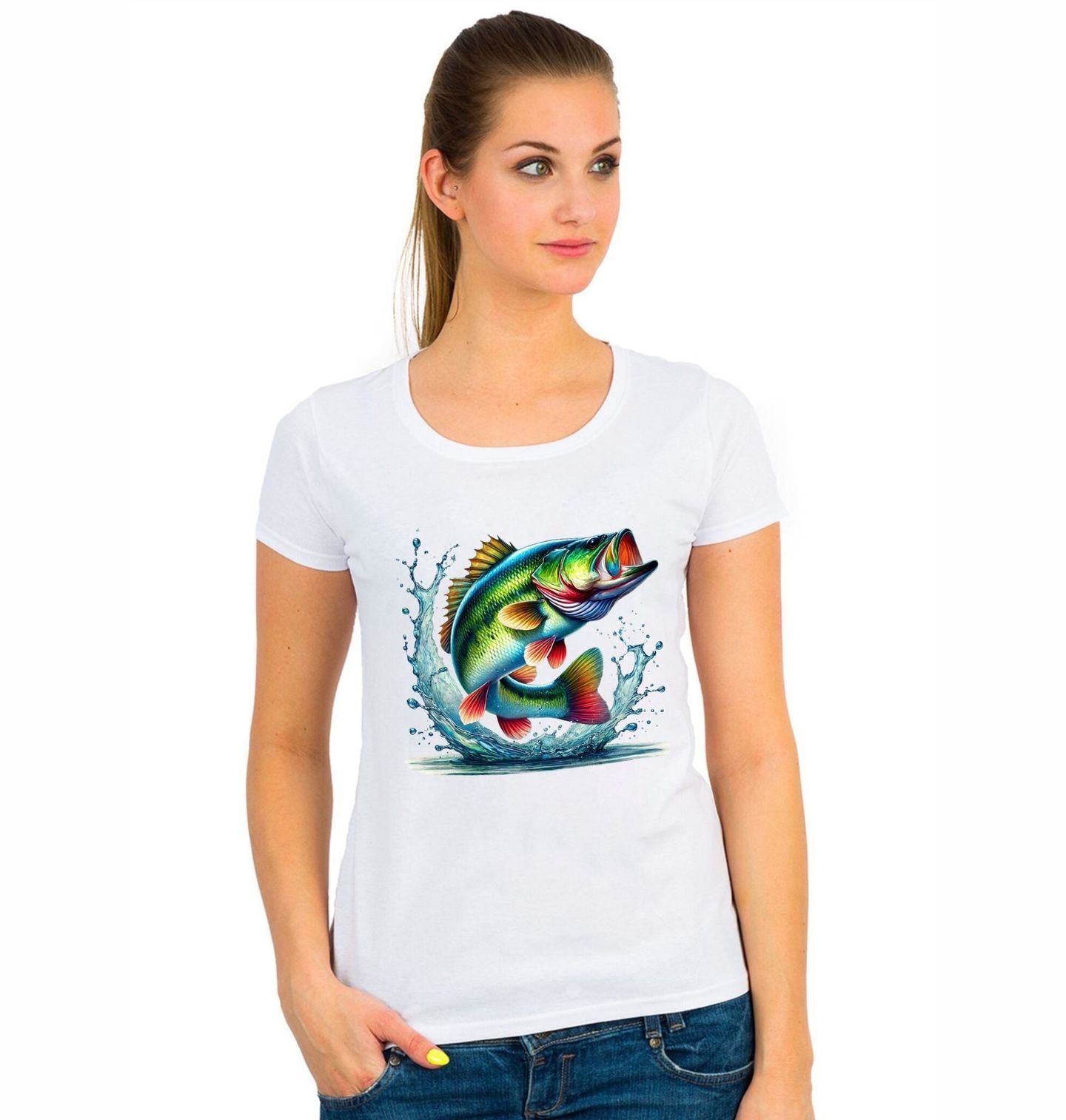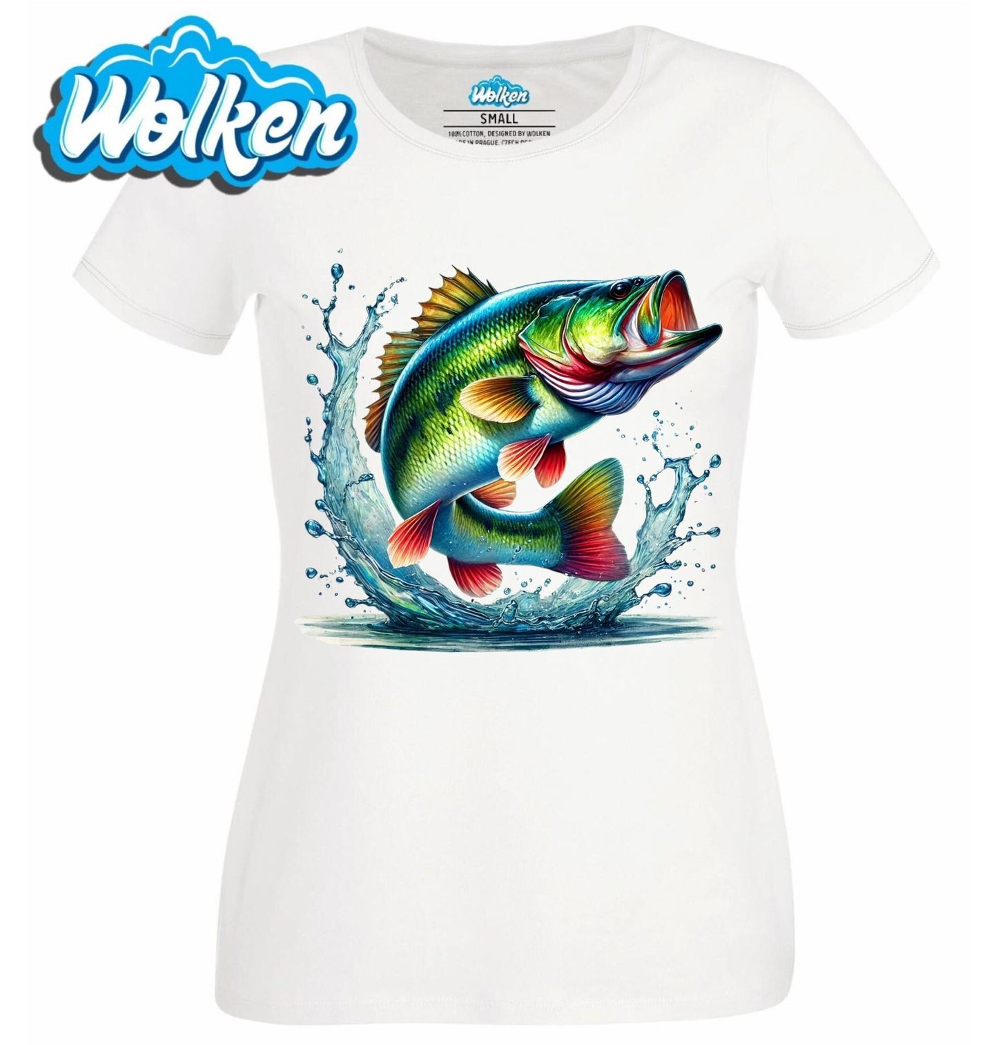 Dámské tričko Okoun ve Vodě. Stylizovaná ryba zachycená při výskoku z vody přináší energii, kterou každý rybář zná z okamžiku záběru. Ideální pro ty, kdo milují přívlač a sportovní rybaření.
