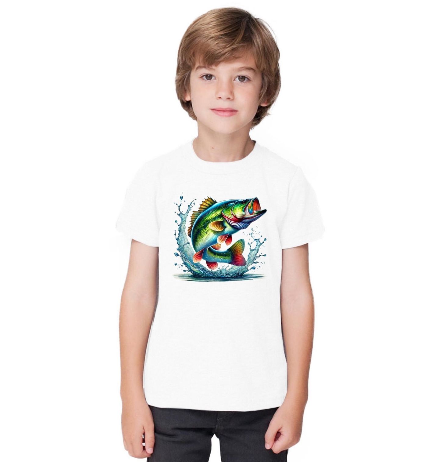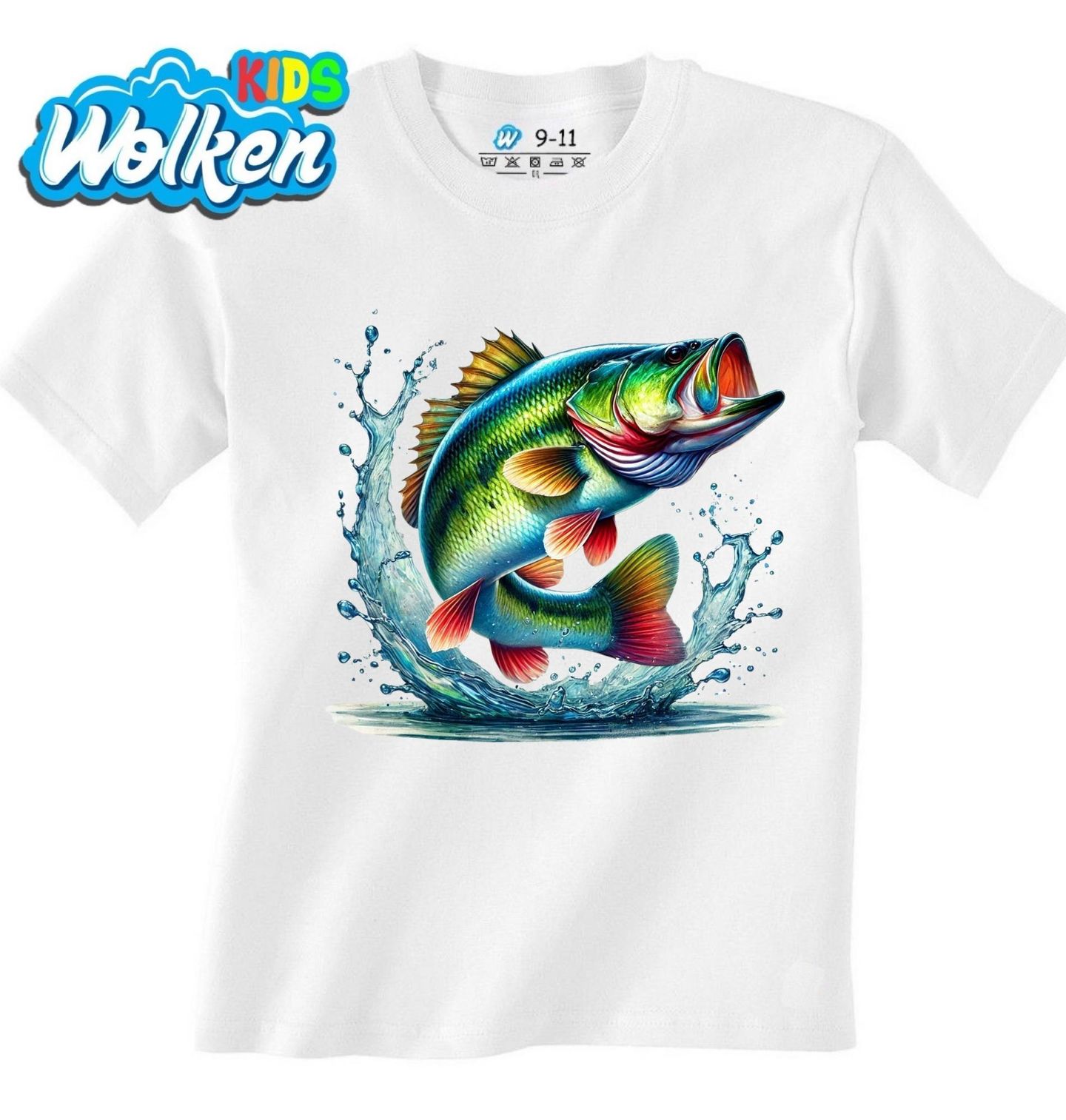 Dětské tričko Okoun ve Vodě. Stylizovaná ryba zachycená při výskoku z vody přináší energii, kterou každý rybář zná z okamžiku záběru. Ideální pro ty, kdo milují přívlač a sportovní rybaření.
