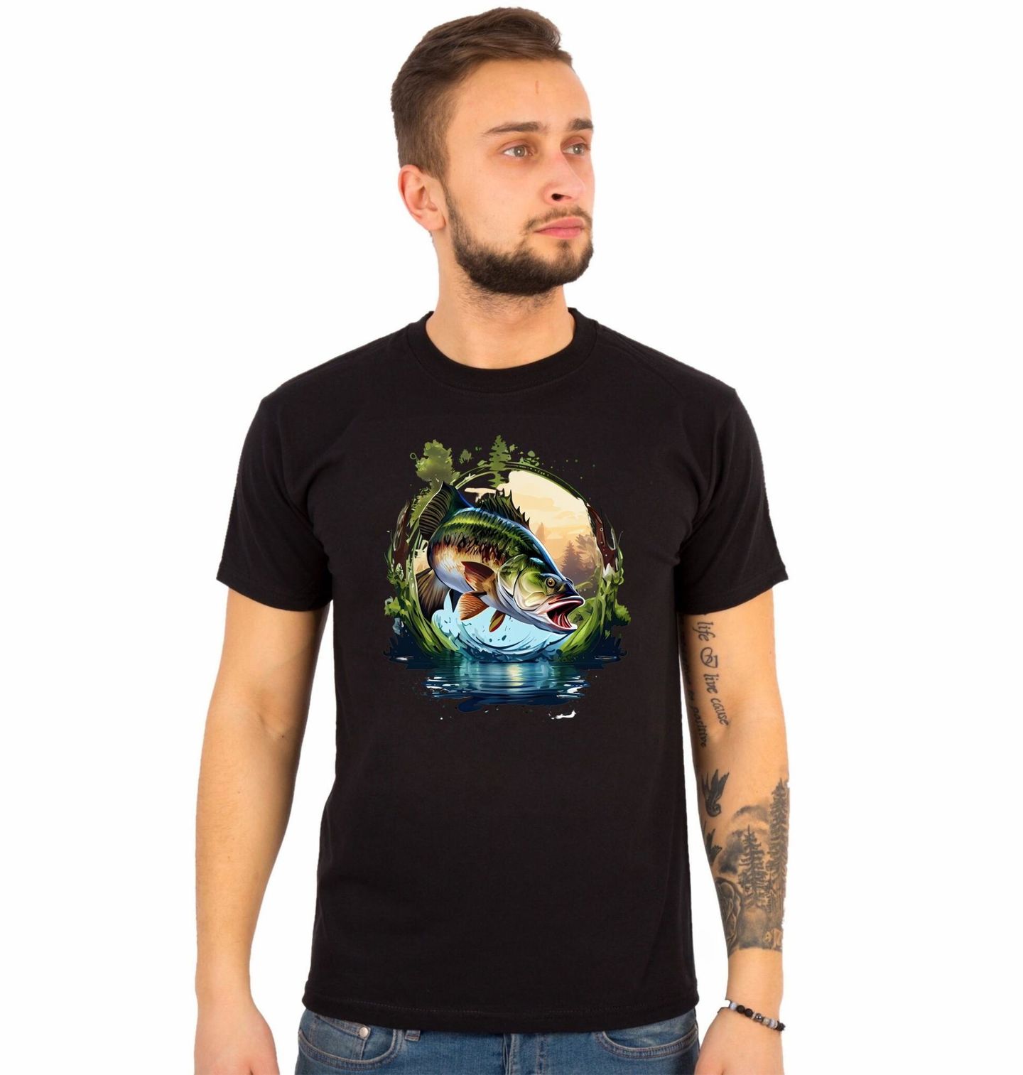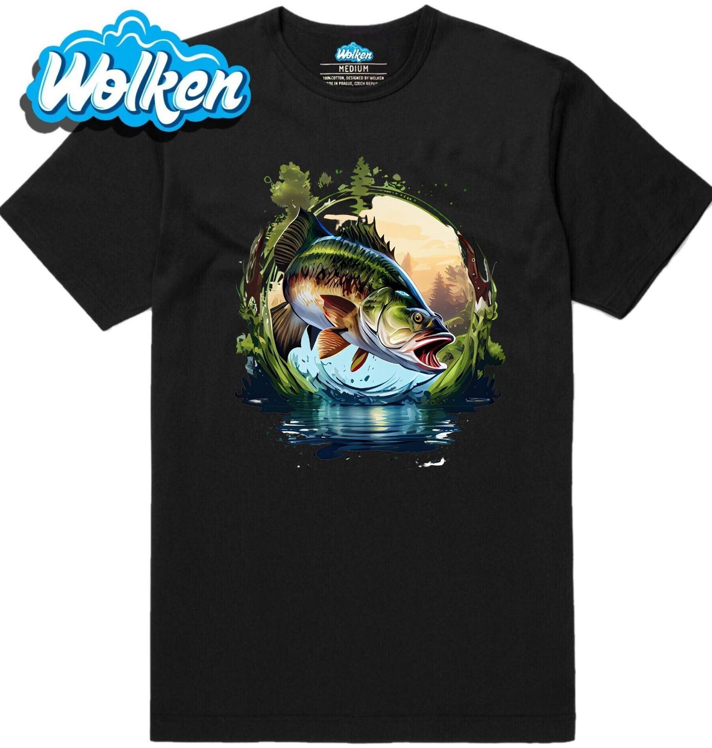 Pánské tričko Okoun z Hlubin Jezera. Krásná přírodní scéna s dravým výskokem okouna přináší motiv, který ocení každý zapálený rybář. Tahle ryba není jen obyčejný úlovek – je to symbol síly, divokosti a ryzího sportovního rybaření.
