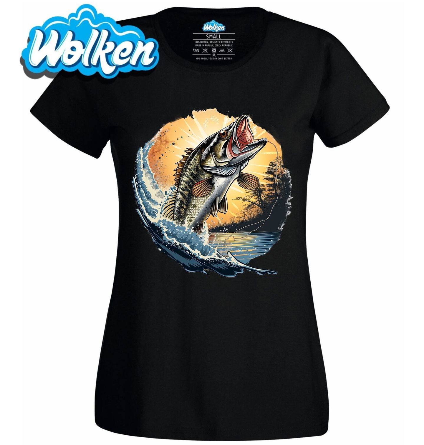Dámské tričko Okounek při Západu Slunce. Tento motiv zachycuje rybu v dramatickém skoku z vody při západu slunce – jedinečný okamžik, který ocení každý vášnivý rybář. Na obrázku je legendární okounek pstruhový (Largemouth bass), ryba oblíbená v rekreačním i sportovním rybaření po celém světě.