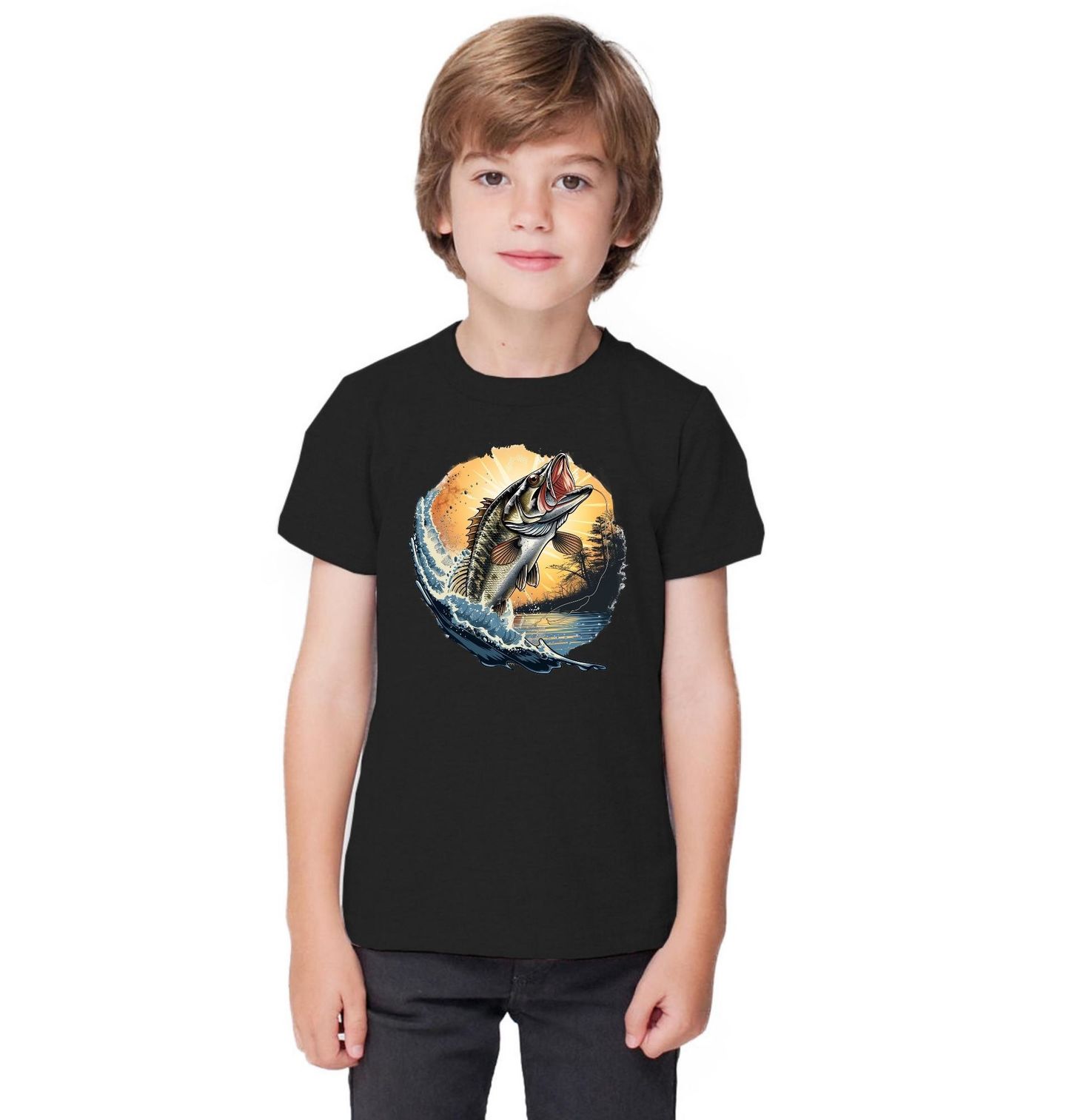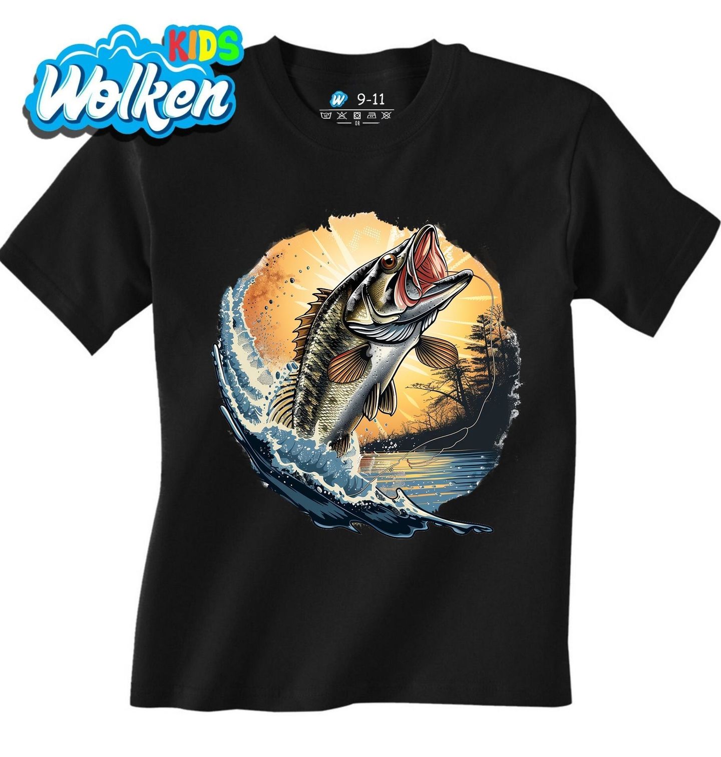 Dětské tričko Okounek při Západu Slunce. Tento motiv zachycuje rybu v dramatickém skoku z vody při západu slunce – jedinečný okamžik, který ocení každý vášnivý rybář. Na obrázku je legendární okounek pstruhový (Largemouth bass), ryba oblíbená v rekreačním i sportovním rybaření po celém světě.