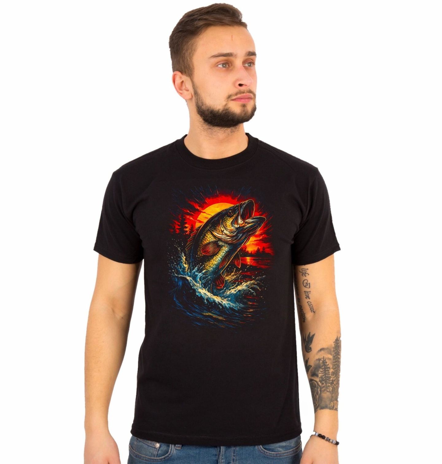 Pánské tričko Okounek pstruhový. Ilustrace zobrazuje dramatický okamžik výskoku při západu slunce – chvíli, kterou si každý rybář pamatuje celý život. Právě takové momenty dělají rybaření vášní, ne jen koníčkem. Okounovec velkoústý je symbolem adrenalinu, trpělivosti a dokonalého načasování.