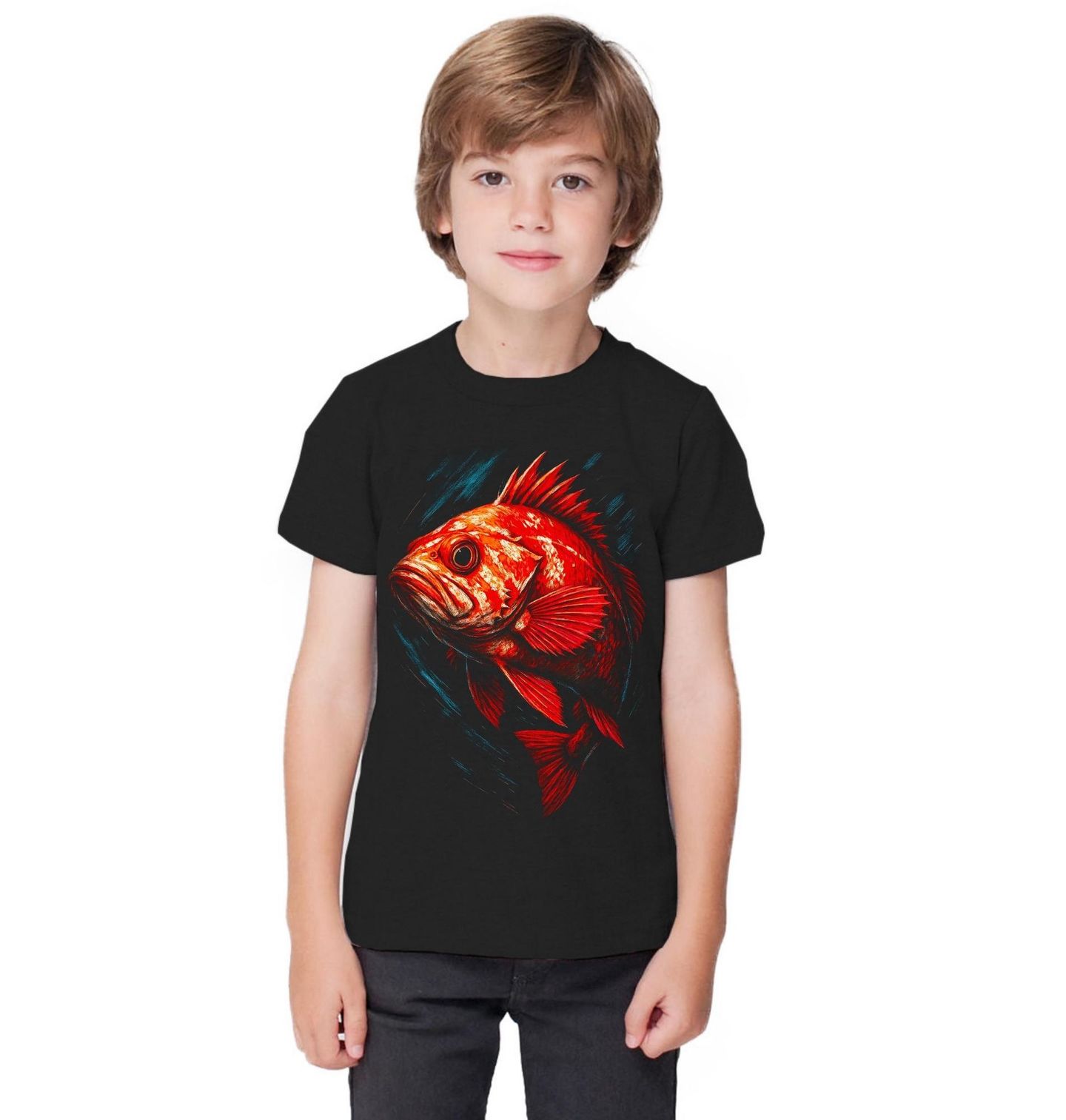 Dětské tričko Okouník modroústý. Helicolenus dactylopterus, růžovka černobřichá, skalník modroústý a mořský okoun obecný, je druh mořské paprskoploutvé ryby. Tato ryba, známá také jako Helicolenus dactylopterus, se nachází v Atlantském, Indickém a Tichém oceánu. Je to dravá, rybáři komerčně lovená ryba, která se často používá v kuchyni.