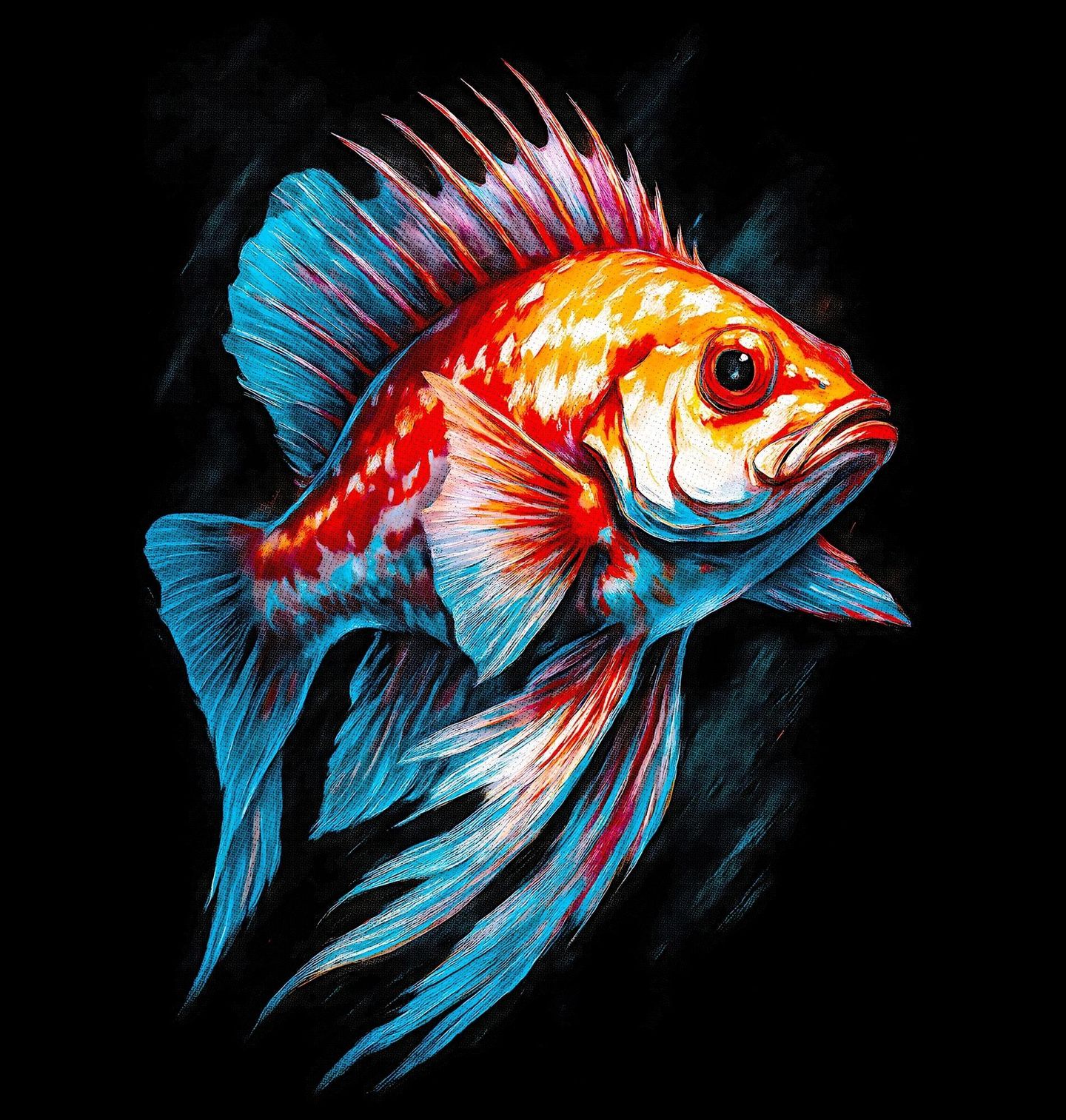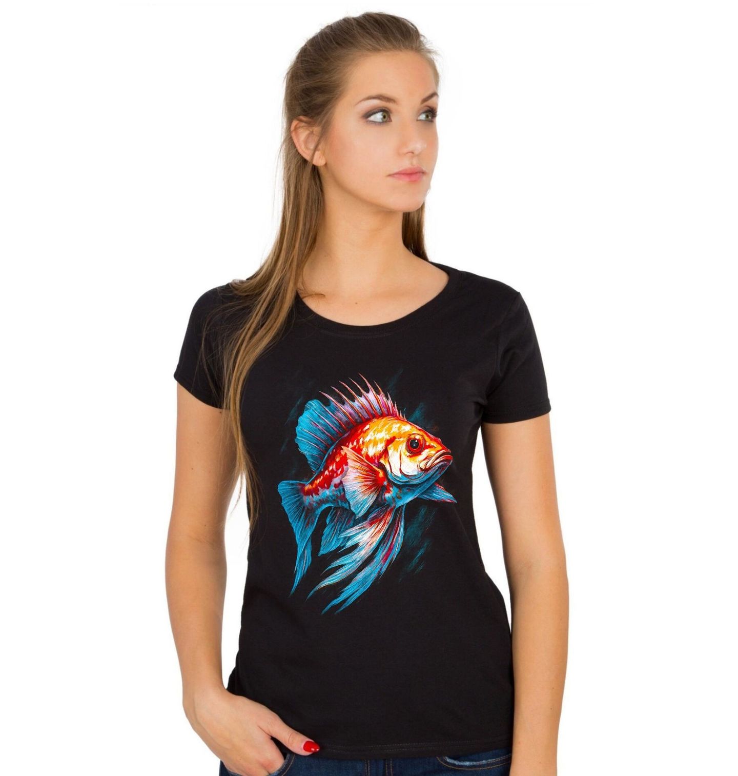 Dámské tričko Okouník pestrý. Mořská ryba známá svým sytým oranžovo-červeným zbarvením a ostnitou hřbetní ploutví. Její dramatický vzhled a klidný, ale autoritativní postoj z ní dělají nepřehlédnutelný symbol hlubších vod Tichého oceánu. Tento motiv připomíná rozmanitost a sílu mořského světa, který fascinuje každého, kdo má blízko k vodě.