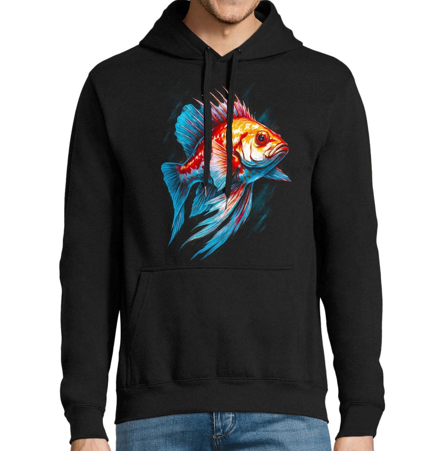 Pánská mikina Okouník pestrý. Mořská ryba známá svým sytým oranžovo-červeným zbarvením a ostnitou hřbetní ploutví. Její dramatický vzhled a klidný, ale autoritativní postoj z ní dělají nepřehlédnutelný symbol hlubších vod Tichého oceánu. Tento motiv připomíná rozmanitost a sílu mořského světa, který fascinuje každého, kdo má blízko k vodě.
