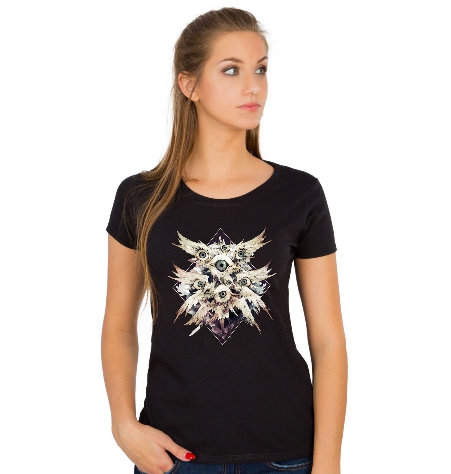 Dámské tričko Okřídlený Anděl Seraphim. Serafín (Seraphim) je v duchovní tradici považován za jeden z nejvyšších andělských řádů – bytost stojící nejblíže božství. Seraphim pochází z judaismu a křesťanství, ale jeho význam se vyvíjel a přenesl i do křesťanské mystiky, angelologie a okultních nauk. S mnoha křídly a vševědoucími oky působí jako nebeský strážce, který vidí vše skryté.