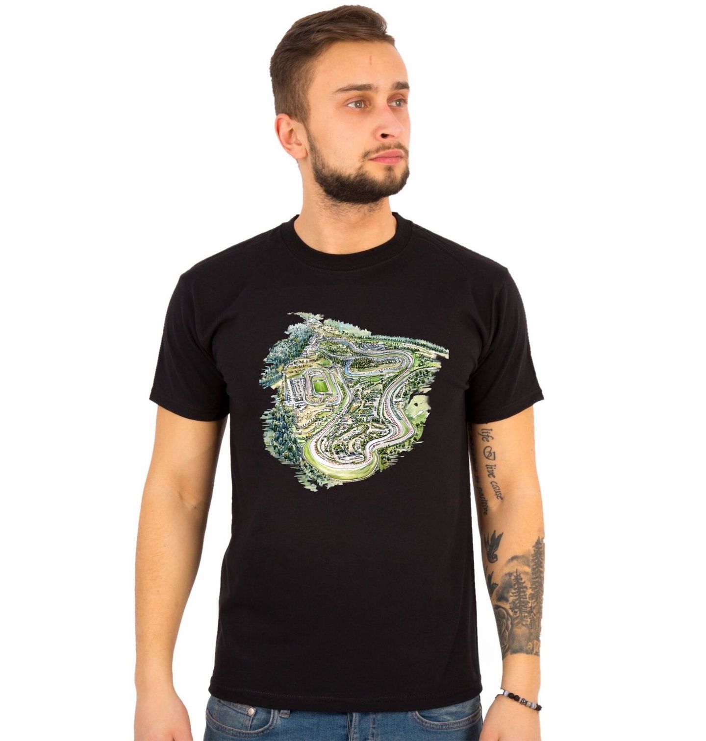 Pánské tričko Okruh šampionů F1. Ilustrovaný motiv zachycující spletitý závodní okruh, kde se každá formule snaží získat nejlepší čas na trati. Tento jedinečný potisk potěší každého fanouška motorsportu, který miluje rychlost, vůni spálených pneumatik a zvuk motorů na okruhu. Ideální pro milovníky závodních her, Formule 1 i automobilového umění.