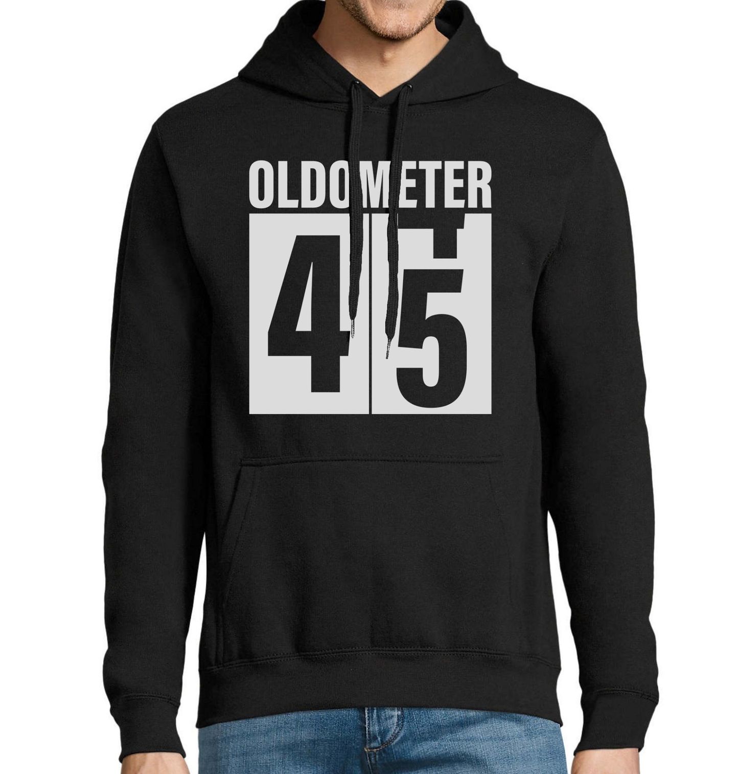 Pánská mikina Oldometer 45. Vtipný design s nápisem „Oldometer 45“, který připomíná počítadlo kilometrů. Číslo 45 je zobrazeno jako stav „najeto“, což symbolizuje věk s humorem. Text na obrázku: „Oldometer 45“ (Počítadlo věku: 45)