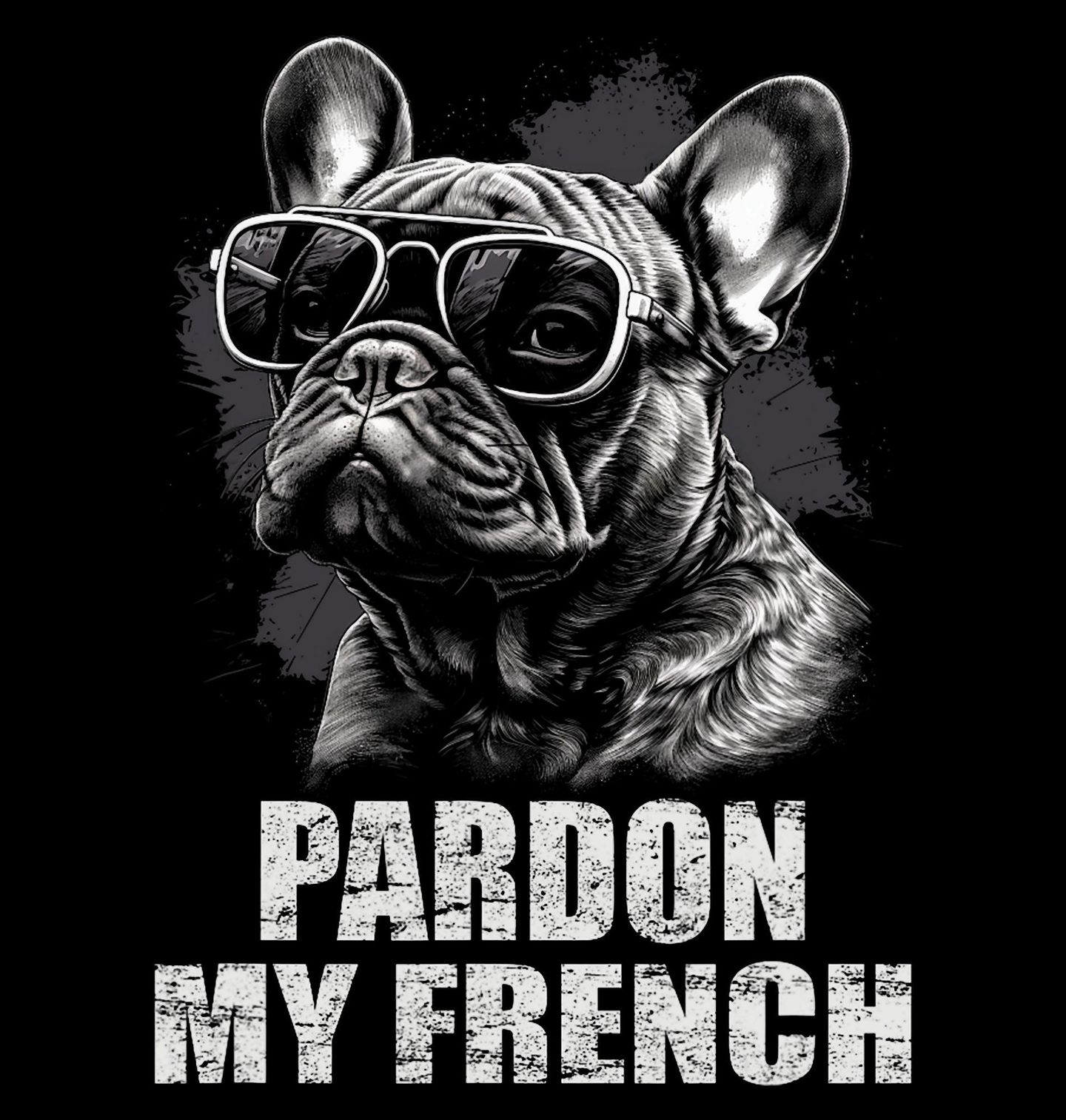 Pánské tričko Omluvte mého Francouzského Buldočka. „Pardon My French“ je věnován plemeni Francouzský buldoček, které je oblíbené pro svůj jedinečný vzhled a charismatickou povahu. Pes v cool brýlích dodává motivu šmrnc a je ideální volbou pro každého pejskaře, který má rád humor a styl.