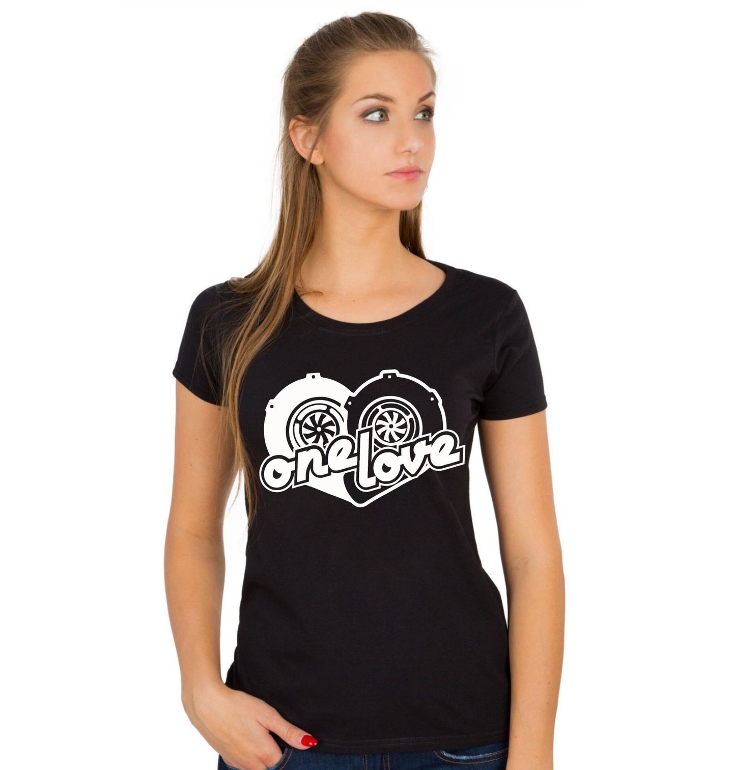 Dámské tričko One Love Turbo. Výrazný tuning motiv pro každého, kdo miluje výkon, zvuk turba a svět upravených aut. Grafika zobrazuje dvě turbodmychadla a stylový nápis „one love“, který symbolizuje vášeň pro rychlost, úpravy a motorsport kulturu. „Jedna láska“ – v tomto případě jde o jasný odkaz na to, že auto, turbo a rychlá jízda jsou pro fanoušky tuningu srdeční záležitostí.