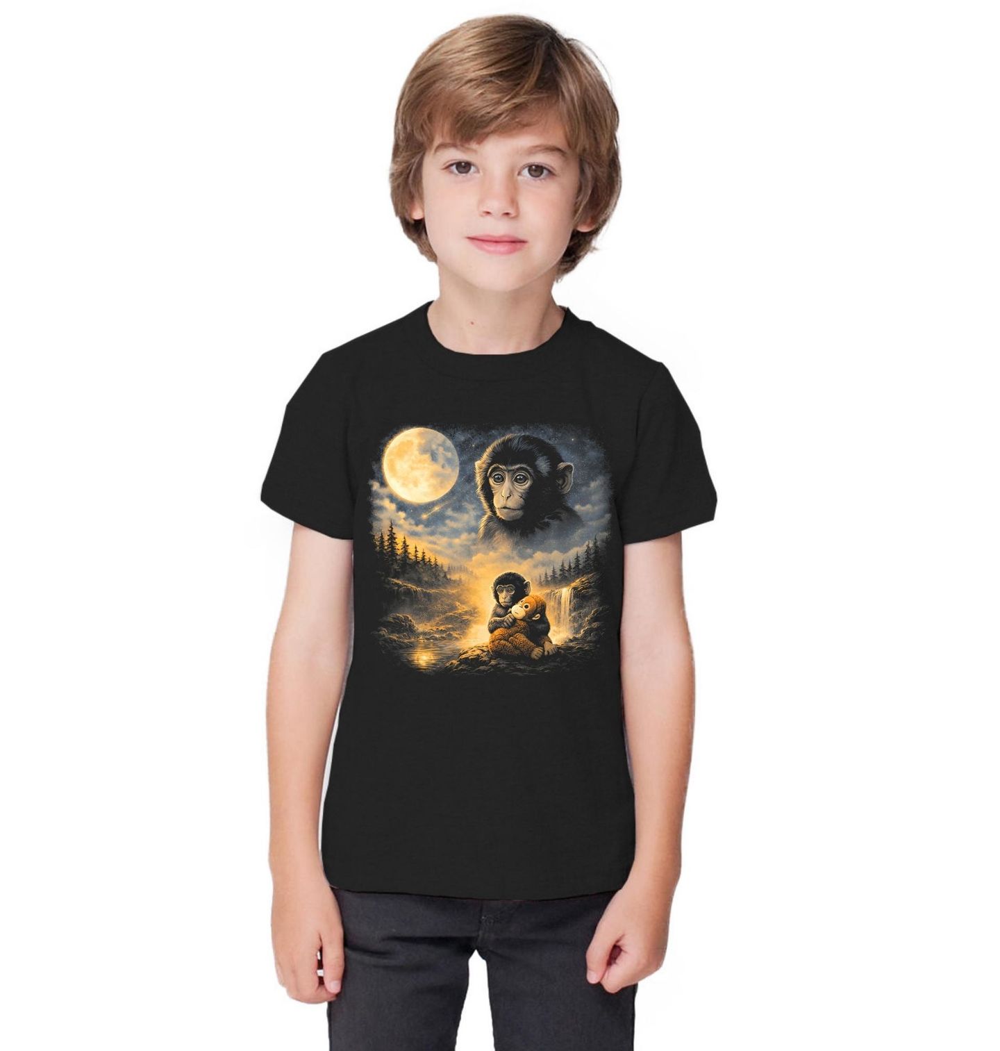 Dětské tričko Opička Punch a Kouzlo Úplňku. Atmosférický design zachycuje roztomilou virální opičku s plyšákem v ruce v noční krajině pod úplňkem. Jemná scenérie s vodopádem a hvězdnou oblohou vytváří pocit klidu, snění a fantazie. Vhodný pro každého, kdo opičce fandí a zastává se jí.