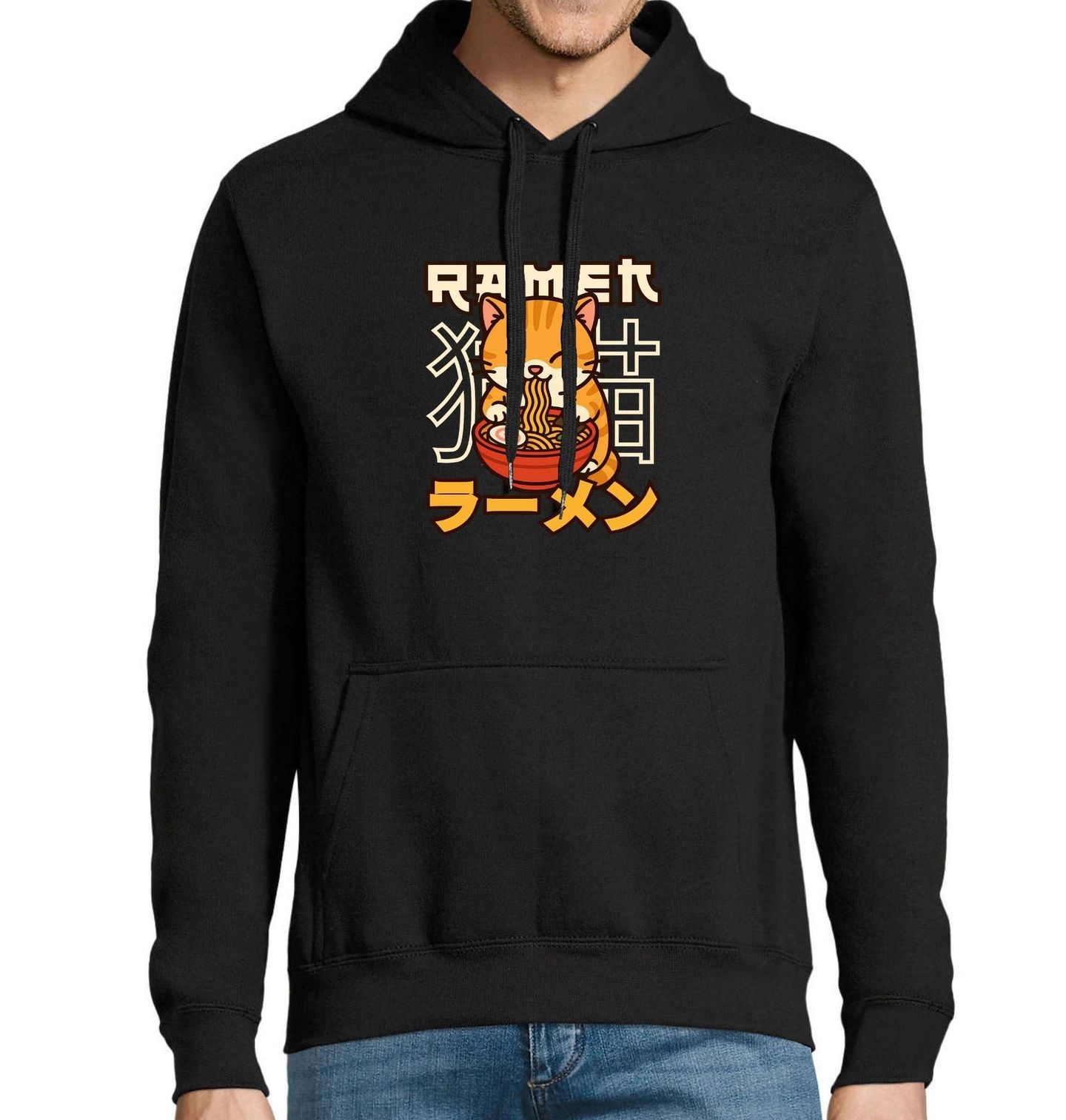 Pánská mikina Oranžová Kočka a Ramen. Roztomilá oranžová kočka si s chutí vychutnává misku tradičního ramenu. Motiv kombinuje lásku ke zvířatům a japonské kultuře v jednom stylovém zpracování. Ideální pro každého, kdo miluje Japonsko, jeho kuchyni a samozřejmě i kočky.