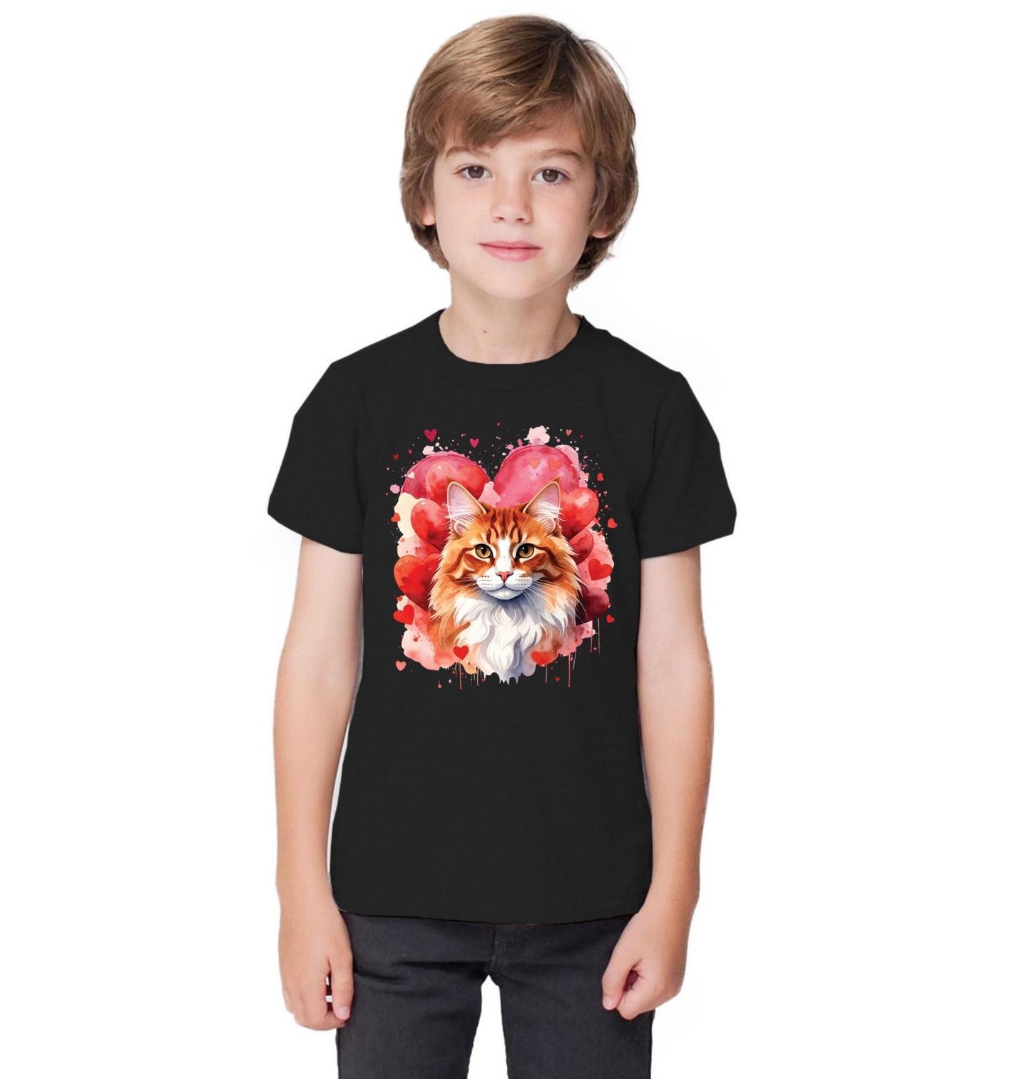 Dětské tričko Oranžová Kočka mezi Srdci. Ilustrace zachycuje symbol lásky, klidu a kočičí pohody. Stylizovaná zrzavá kočka působí přátelsky a romanticky, což z tohoto motivu dělá ideální volbu pro milovníky koček, zvířecích motivů a dárků plných emocí. Skvěle se hodí jako originální doplněk nebo dárek z lásky.
