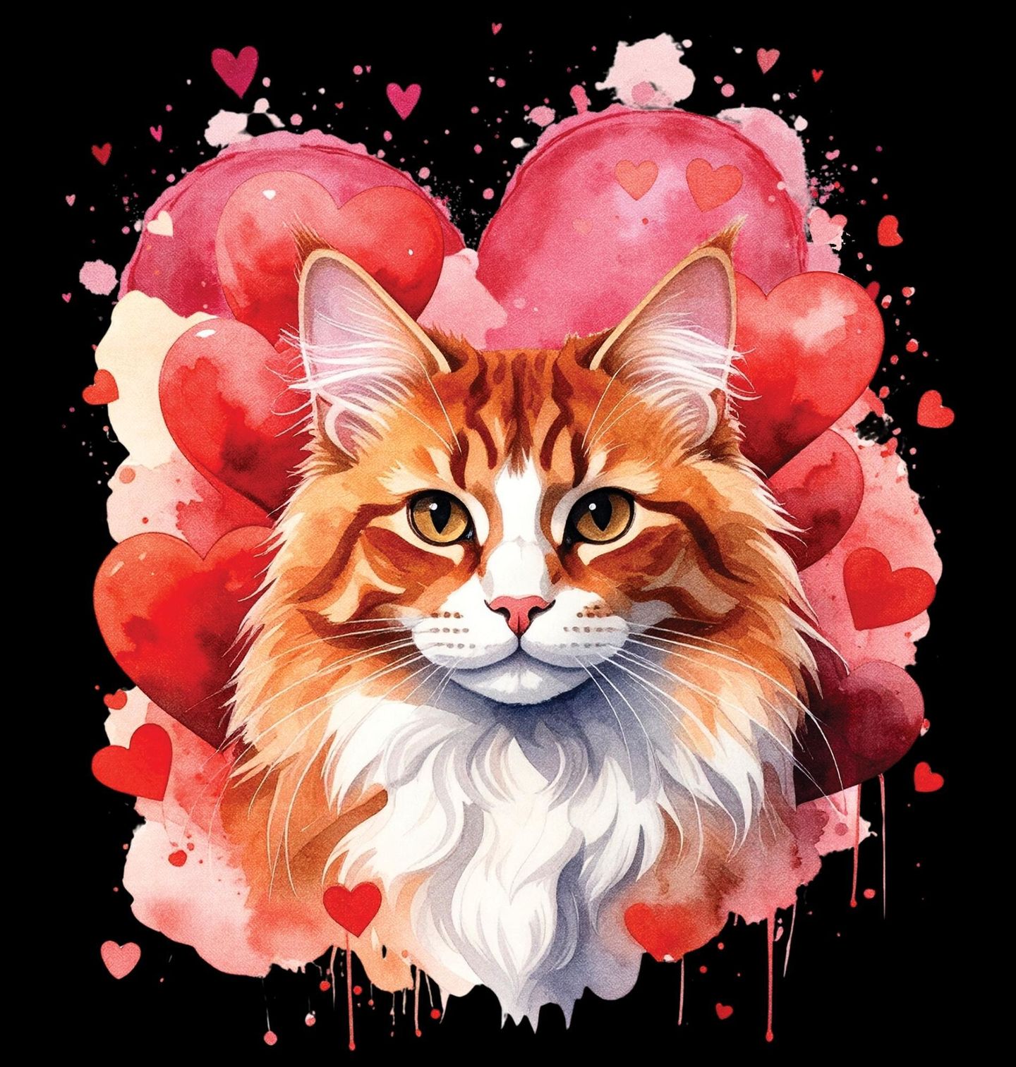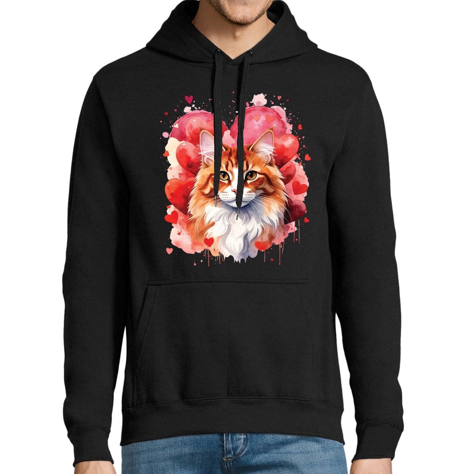 Pánská mikina Oranžová Kočka mezi Srdci. Ilustrace zachycuje symbol lásky, klidu a kočičí pohody. Stylizovaná zrzavá kočka působí přátelsky a romanticky, což z tohoto motivu dělá ideální volbu pro milovníky koček, zvířecích motivů a dárků plných emocí. Skvěle se hodí jako originální doplněk nebo dárek z lásky.