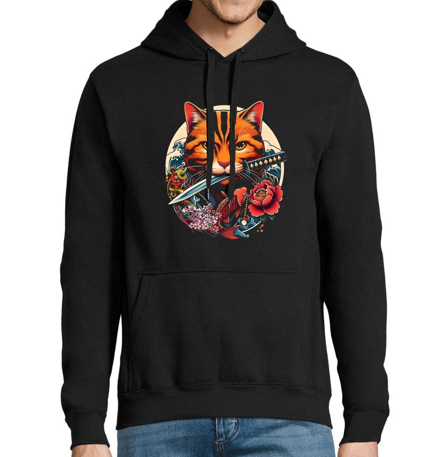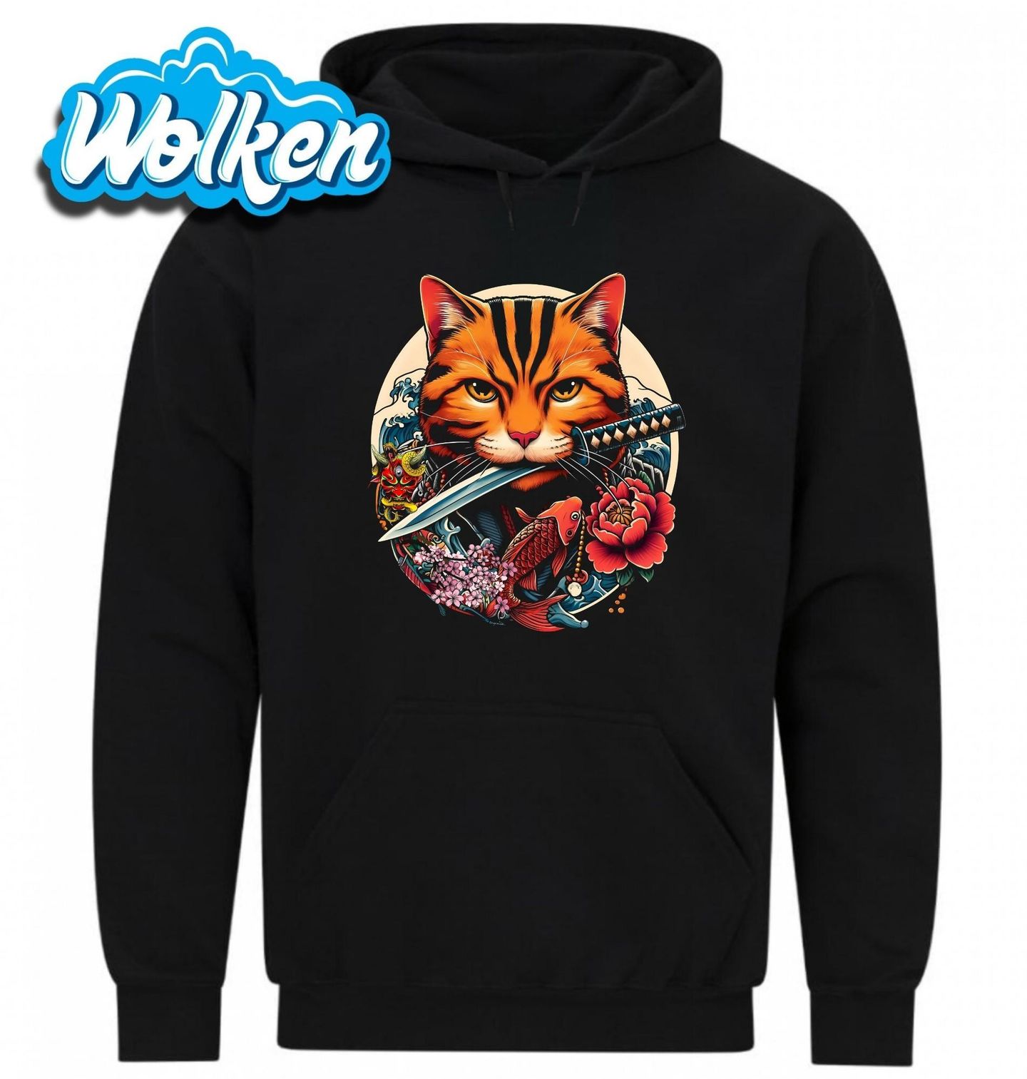 Pánská mikina Oranžová Kočka Ostří Katany. Výrazná kočka s tygřím pohledem drží katanu mezi zuby. Vidíme tradiční Japonsko – koi kapra, masku oni, sakury a vlny. Tento samurajský motiv symbolizuje vnitřní sílu, čest a rovnováhu – ideální pro milovníky koček, japonské kultury a originálních designů s hlubším příběhem.