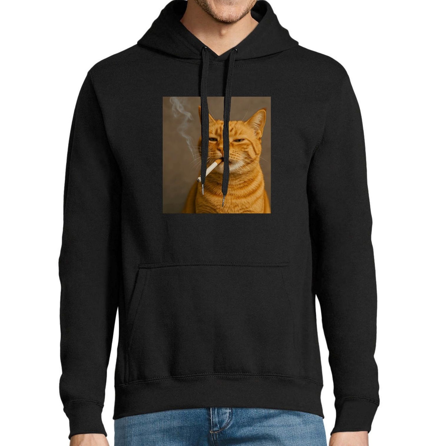Pánská mikina Oranžová Kočka s Cigaretou. Tento design je parodií na gangsterské a drsňácké filmové plakáty, kdy hlavní hrdina působí naprosto neotřesitelně a nad věcí. Ideální pro milovníky koček, cigaretové estetiky a brainrot humoru, kteří chtějí pobavit sebe i okolí. Tričko je perfektní jako odvážný dárek nebo součást streetwear outfitu, se kterým rozhodně nezapadnete.