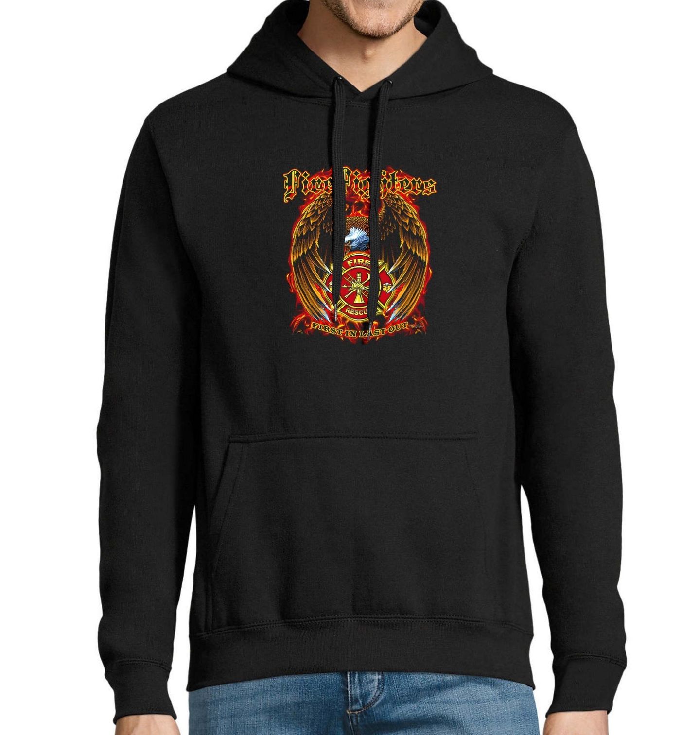 Pánská mikina Orel a Hasičský Znak v Plamenech. Firefighters First In, Last Out – První dovnitř, poslední ven. Motiv, který vyjadřuje odvahu, čest a nasazení – majestátní orel rozepíná křídla nad znakem hasičů, obklopený plameny a symbolem záchrany. Tento ikonický design vzdává hold všem, kteří jdou do akce jako první a odcházejí jako poslední – hasičům.