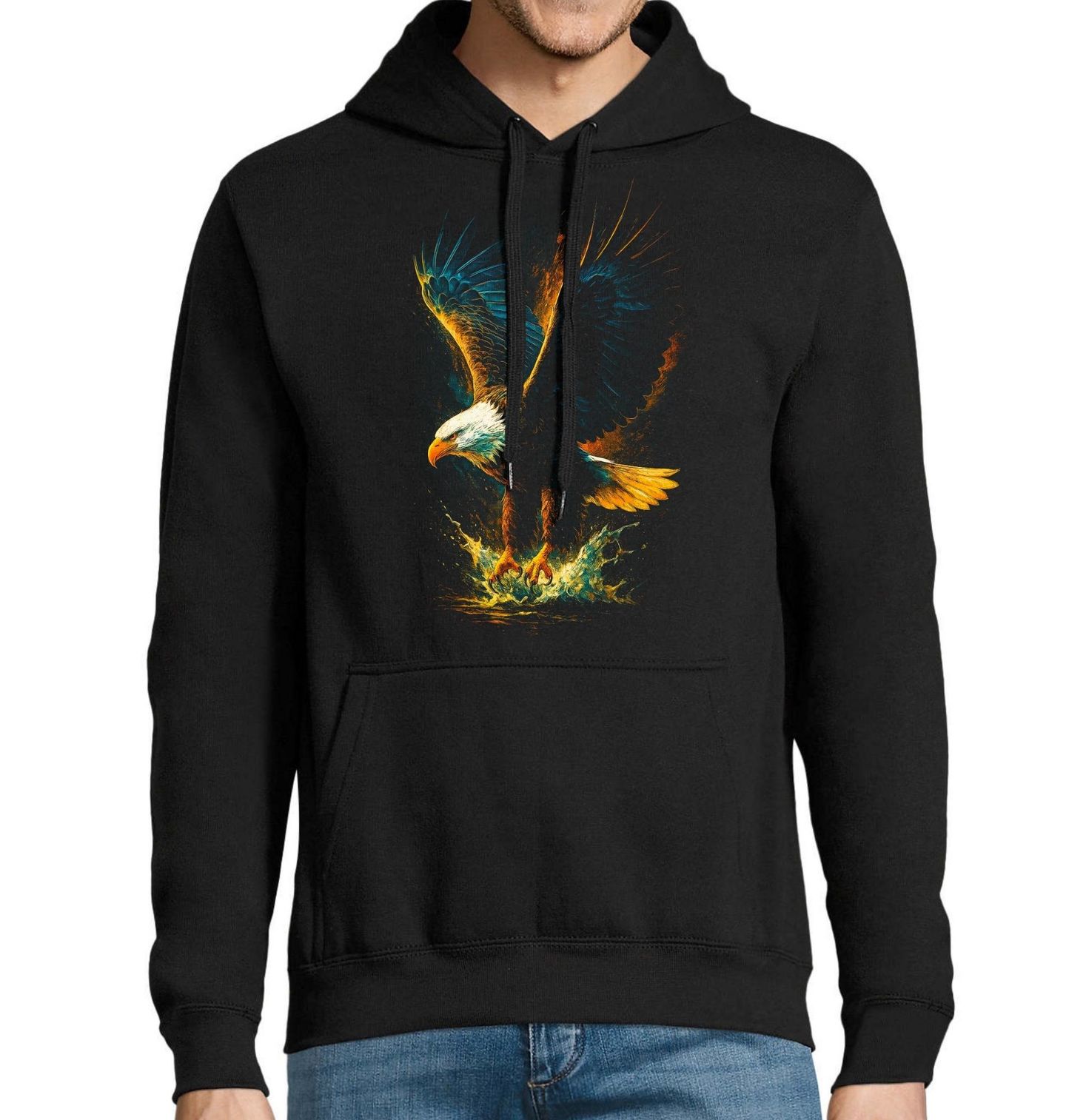 Pánská mikina Orel bělohlavý v Letu. Orel bělohlavý je majestátní pták, zachycený v okamžiku útoku s rozepjatými křídly a ostrými pařáty, což dodává designu energii, napětí a nekompromisní výraz. Ilustrace v kontrastu světla a temnoty podtrhuje jeho divokou povahu a činí z tohoto motivu výrazný vizuální prvek pro všechny milovníky dravé přírody a silných symbolů.