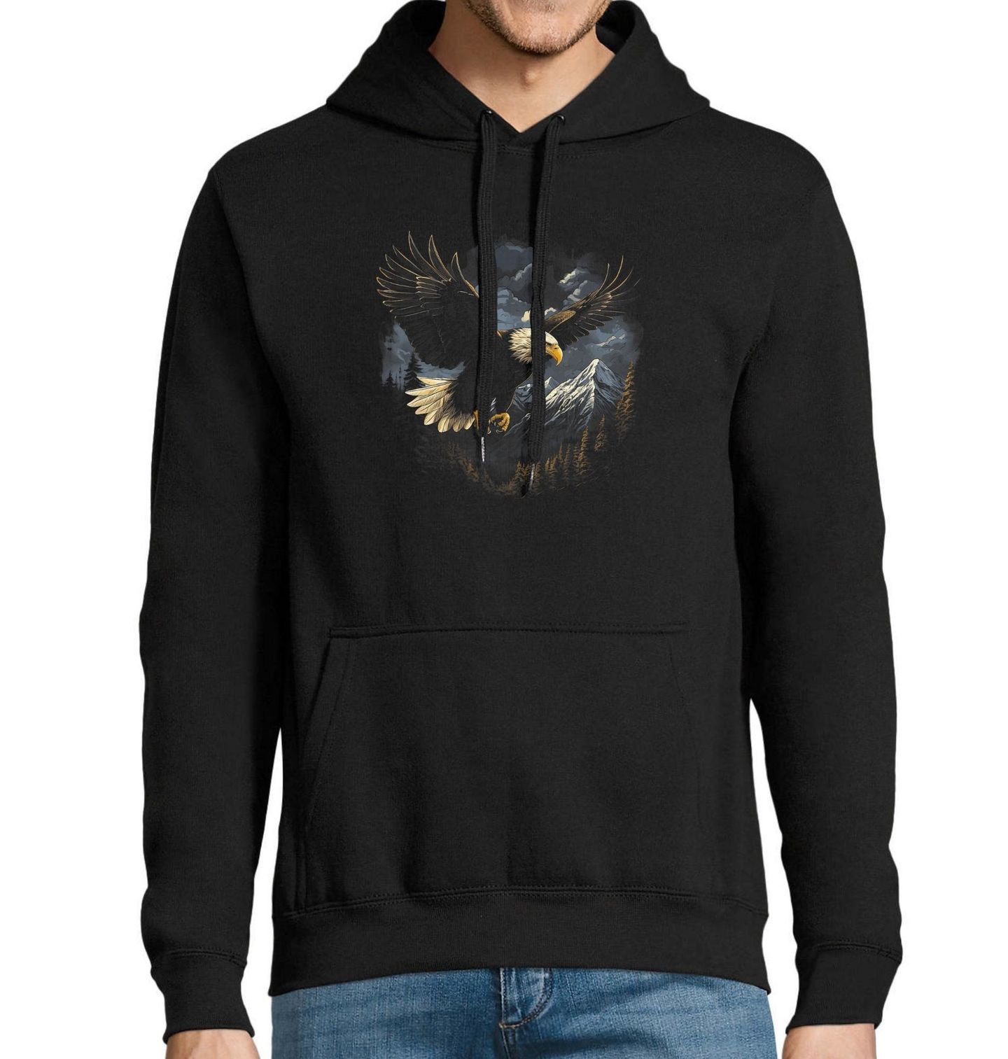 Pánská mikina Orel nad Horami. Tričko s majestátním motivem orla v letu nad zasněženými vrcholky hor symbolizuje svobodu, sílu a odhodlání. Orel, král oblohy, zachycen v dynamickém momentu s roztaženými křídly, působí impozantně a inspirativně. Tento design potěší každého milovníka divoké přírody, hor a volnosti, kterou orel zosobňuje.