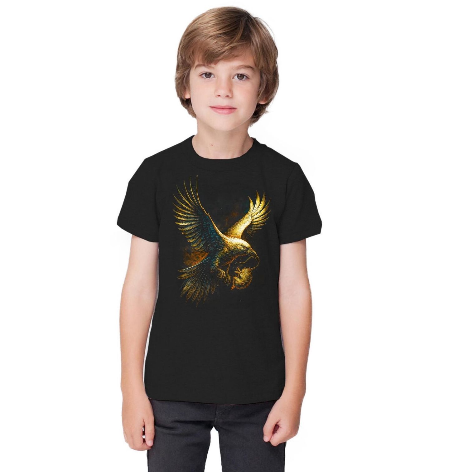 Dětské tričko Orel skalní s Kořistí. Tento majestátní orel se snáší z výšky a ve svých pařátech pevně drží svou kořist – drobnou myš, která podtrhuje přirozený koloběh života. Detailní zpracování zdůrazňuje sílu, rychlost a přesnost, kterou Golden eagle představuje. Každý pohyb křídel i pohled tohoto predátora vyzařuje respekt a instinkt. Orel zde symbolizuje svobodu, nadřazenost a schopnost vidět dál než ostatní.