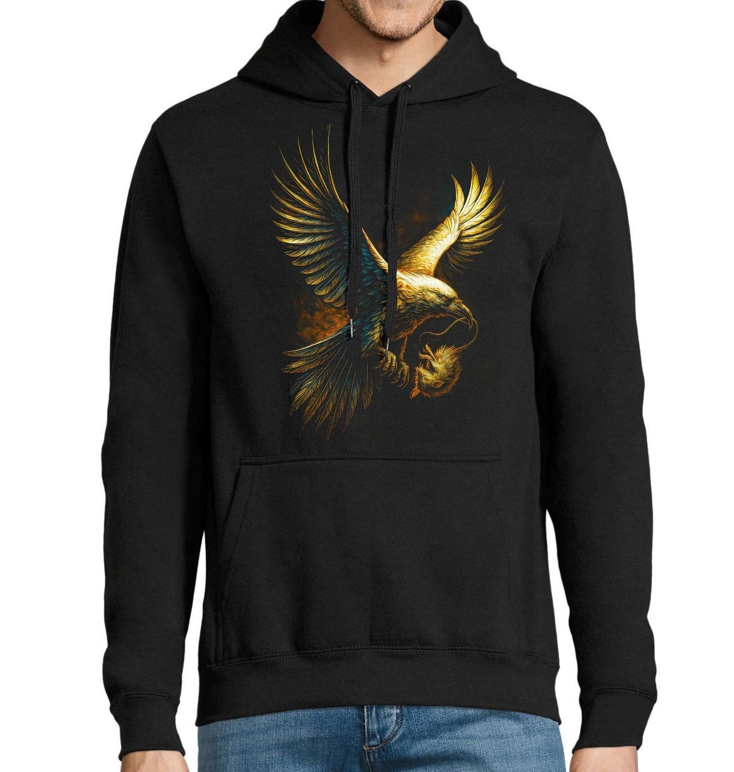 Pánská mikina Orel skalní s Kořistí. Tento majestátní orel se snáší z výšky a ve svých pařátech pevně drží svou kořist – drobnou myš, která podtrhuje přirozený koloběh života. Detailní zpracování zdůrazňuje sílu, rychlost a přesnost, kterou Golden eagle představuje. Každý pohyb křídel i pohled tohoto predátora vyzařuje respekt a instinkt. Orel zde symbolizuje svobodu, nadřazenost a schopnost vidět dál než ostatní.