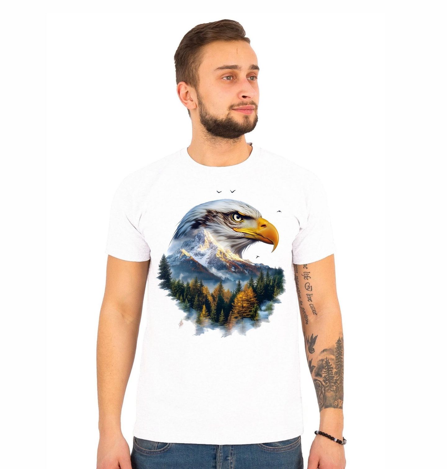 Pánské tričko Orel v Horské Krajině. Působivý motiv zachycuje majestátního orla v dokonalém spojení s horskou scenérií, kde se prolíná divoká krajina plná lesů, mlhy a vrcholů hor. Tento design vyjadřuje svobodu, sílu a nadhled, který orel symbolizuje, a osloví každého milovníka přírody i dechberoucí krajiny.