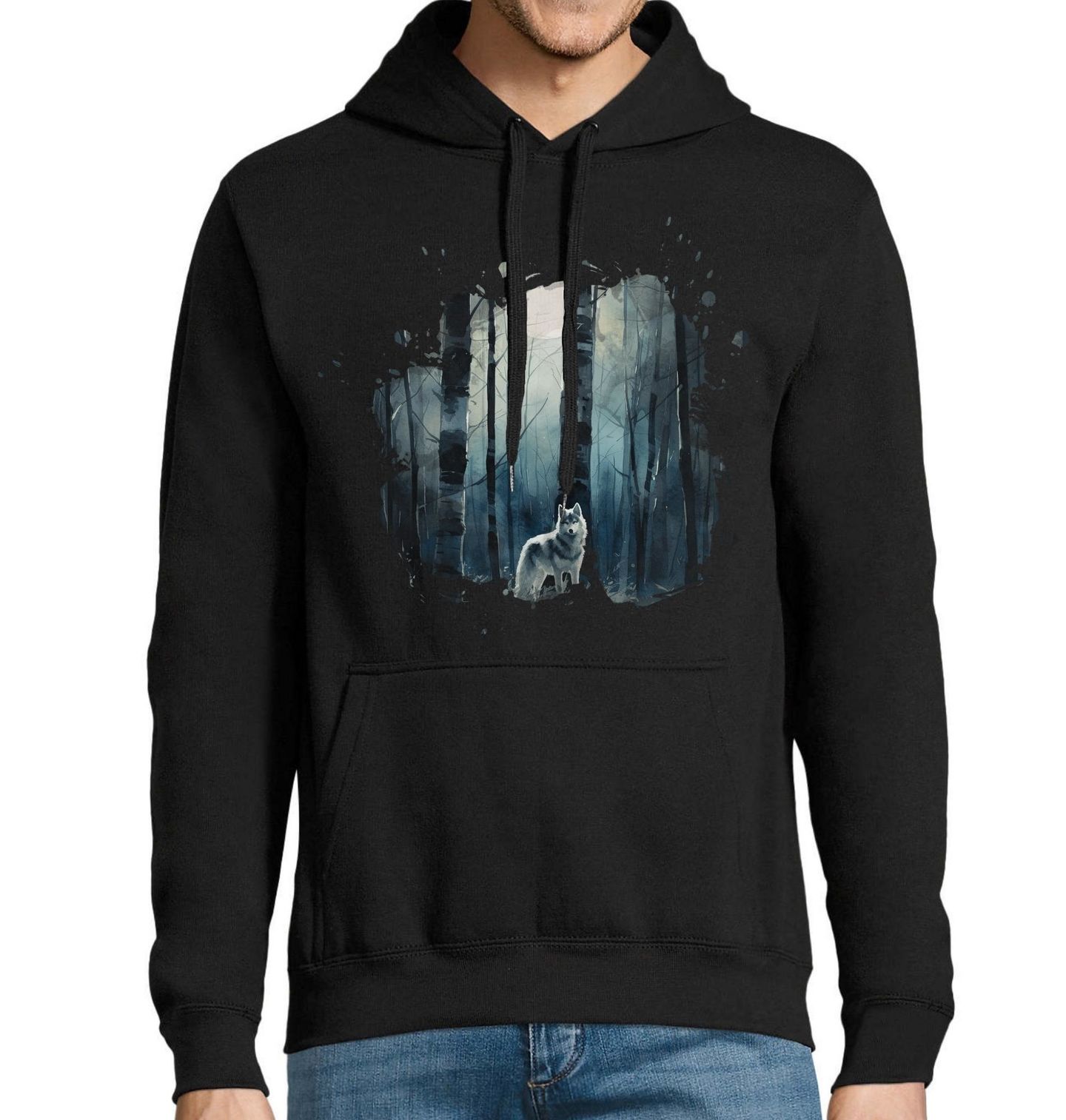 Pánská mikina Osamělý Vlk v Lese. Vlk obecný stojící v hlubokém, mlhavém prostředí, kde vládne klid a síla přírody. Osamělý vlk pozorně sleduje své okolí a stává se symbolem svobody, instinktu a nespoutané divočiny. Atmosféra chladného lesa podtrhuje respekt k přírodě a její rovnováze, kterou les představuje jako domov vlka i místo ticha a tajemství.