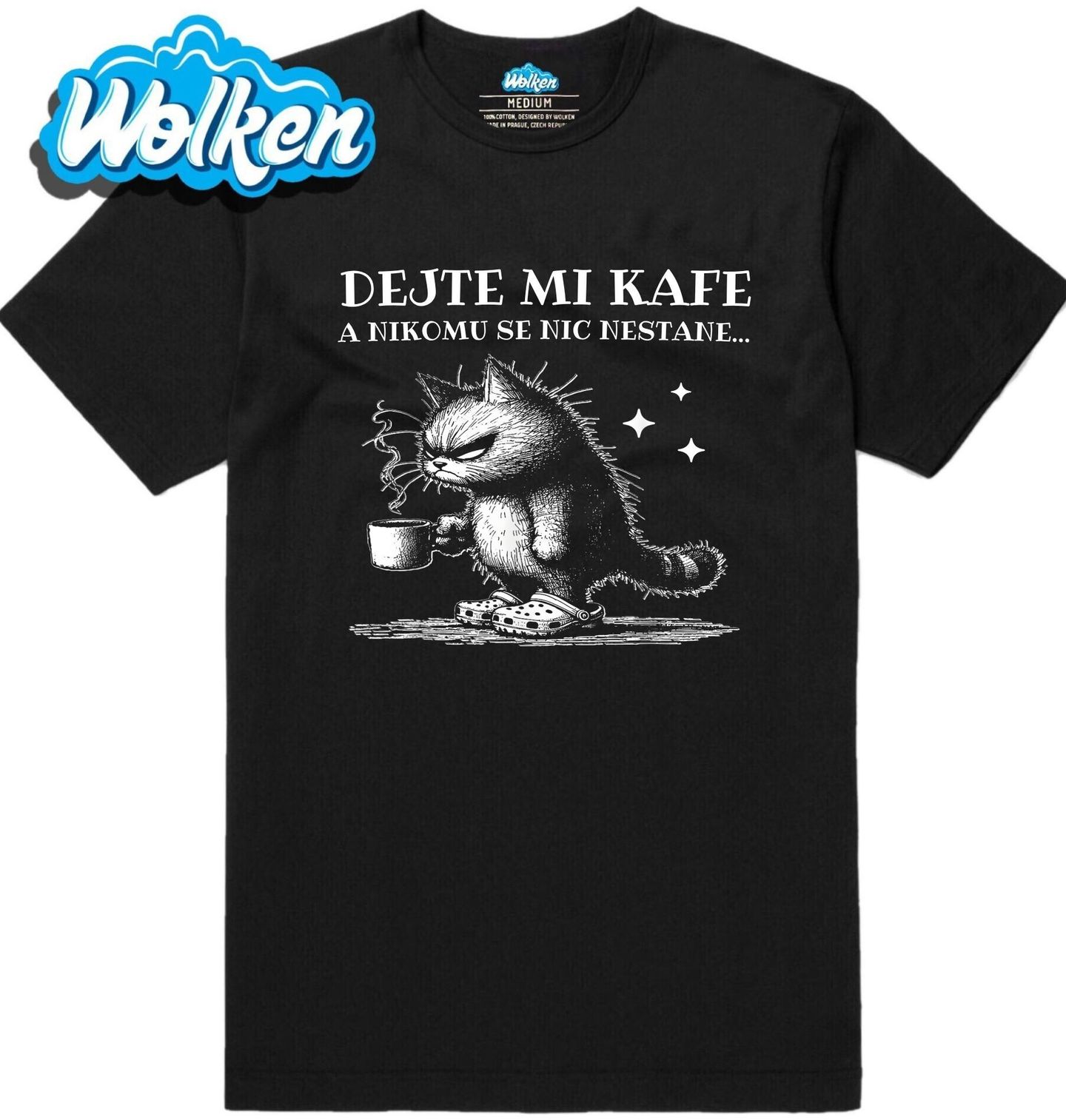 Pánské tričko Ospalá Kočka Dejte mi kafe a nikomu se nic nestane...Ne každý zvládá ráno s úsměvem… tahle kočka rozhodně ne. Rozježená, otrávená, ale naprosto upřímná kočka s hrnkem kafe v packách přesně ví, co potřebuje, aby přežila den – ať už jde o pondělní porady nebo rodinné konverzace.