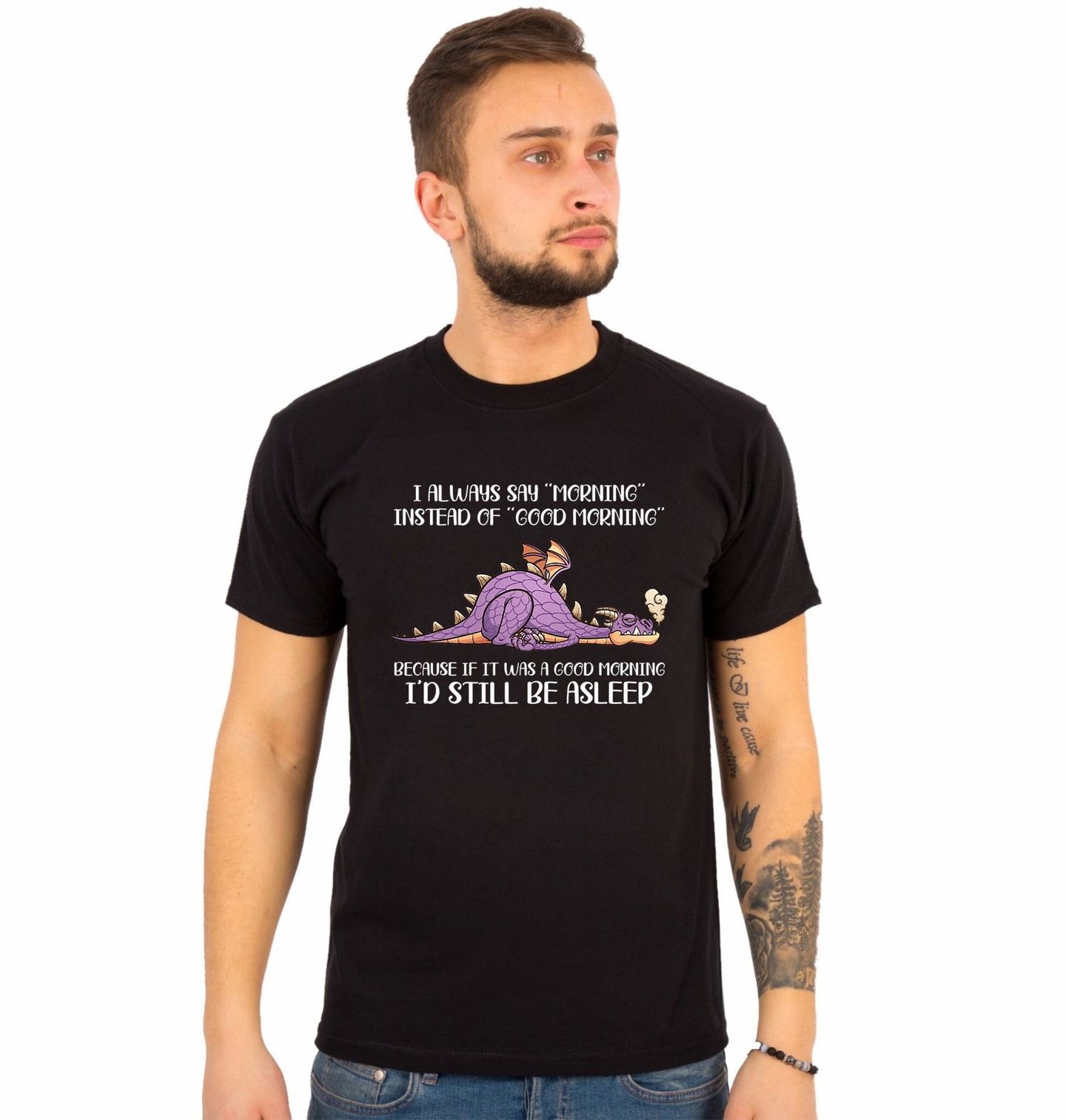 Pánské tričko Ospalý Drak. „I always say ‘morning’ instead of ‘good morning’ because if it was a good morning I’d still be asleep“ česky „Vždycky říkám jen ‘ráno’ místo ‘dobré ráno’, protože kdyby bylo dobré, ještě bych spal.“ Tento ospalý drak říká nahlas to, co si myslí každý nemilovník ranního vstávání.