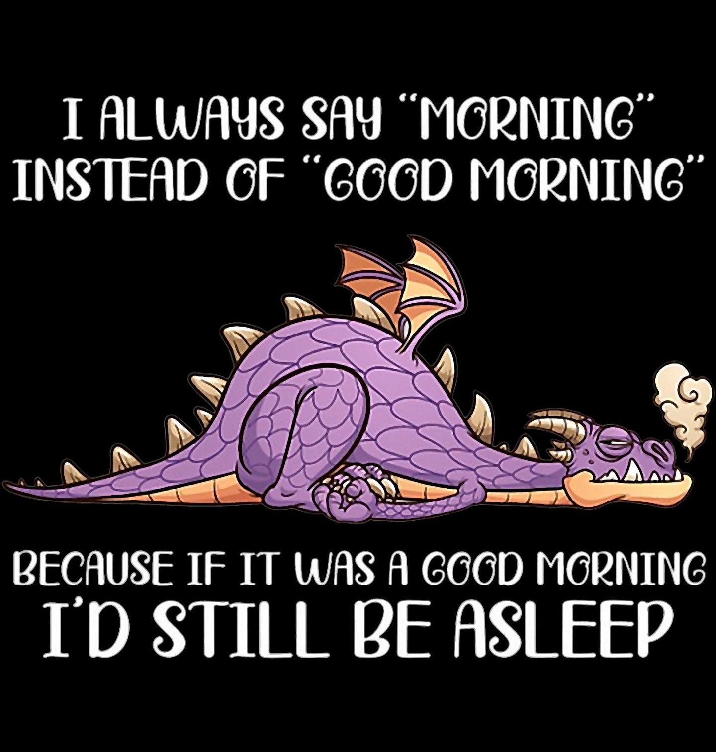 Dámské tričko Ospalý Drak. „I always say ‘morning’ instead of ‘good morning’ because if it was a good morning I’d still be asleep“ česky „Vždycky říkám jen ‘ráno’ místo ‘dobré ráno’, protože kdyby bylo dobré, ještě bych spal.“ Tento ospalý drak říká nahlas to, co si myslí každý nemilovník ranního vstávání.