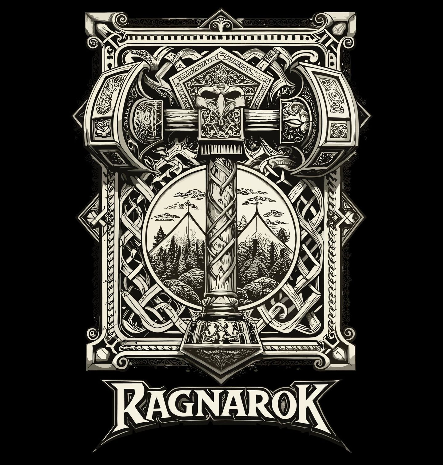 Dětské tričko Osud Bohů Ragnarök. Ragnarök (v překladu „osud bohů“) označuje v severské mytologii sérii apokalyptických událostí a konečnou bitvu, která vede ke zkáze světa, smrti mnoha božstev (včetně Odina a Thora) a následnému znovuzrození světa. Dominantou designu je posvátné kladivo Mjölnir obklopené nordskými uzly.