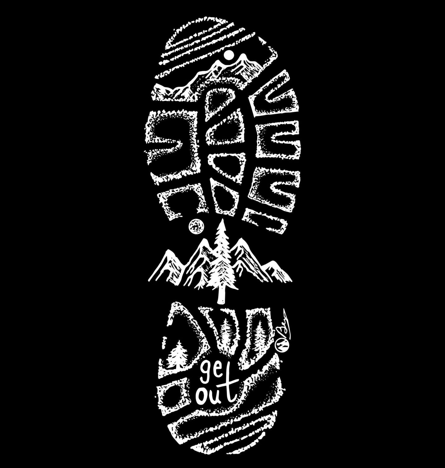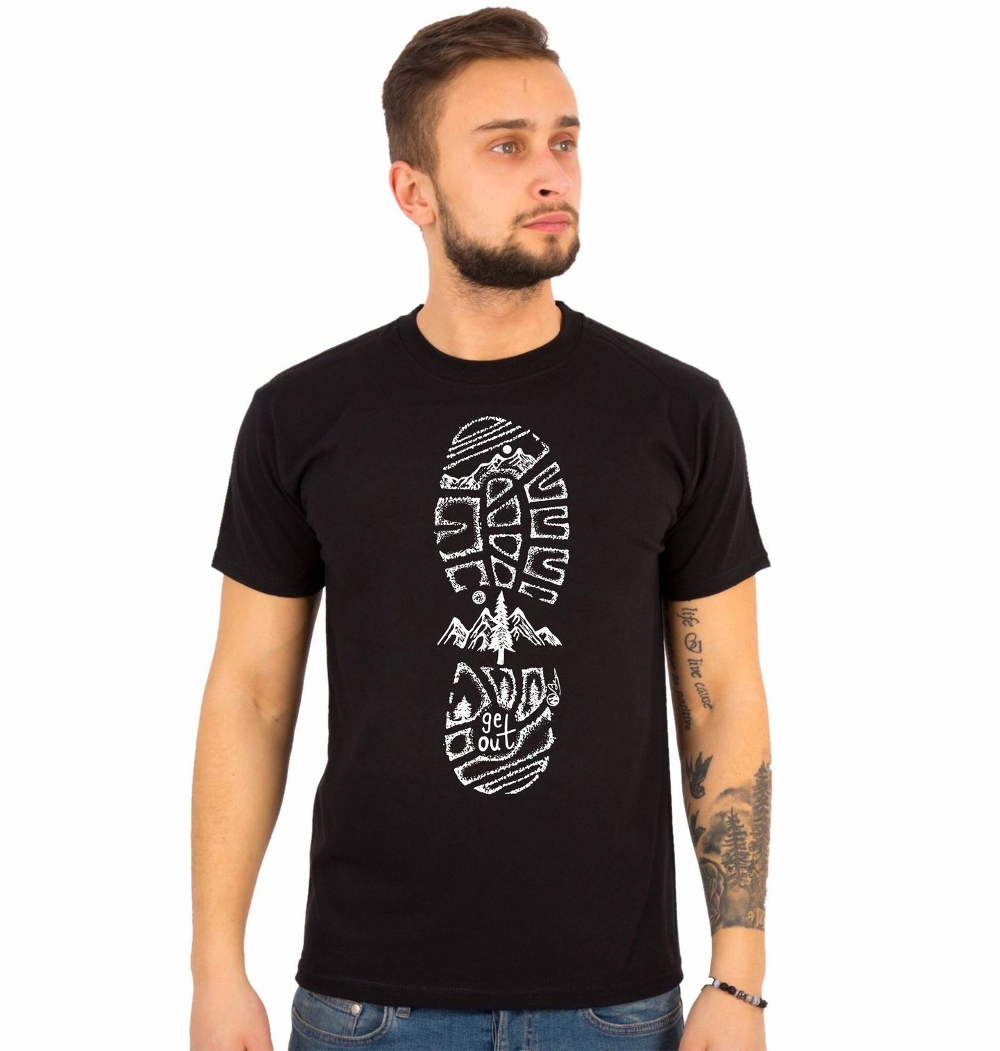 Pánské tričko Otisk boty Vylez ven! Get Out. Vtipný a kreativní motiv – podrážka turistické boty s celým světem uvnitř. Hory, stromy, oheň, hiking, camping a výzva Get Out čekají na každého, kdo má duši dobrodruha.
