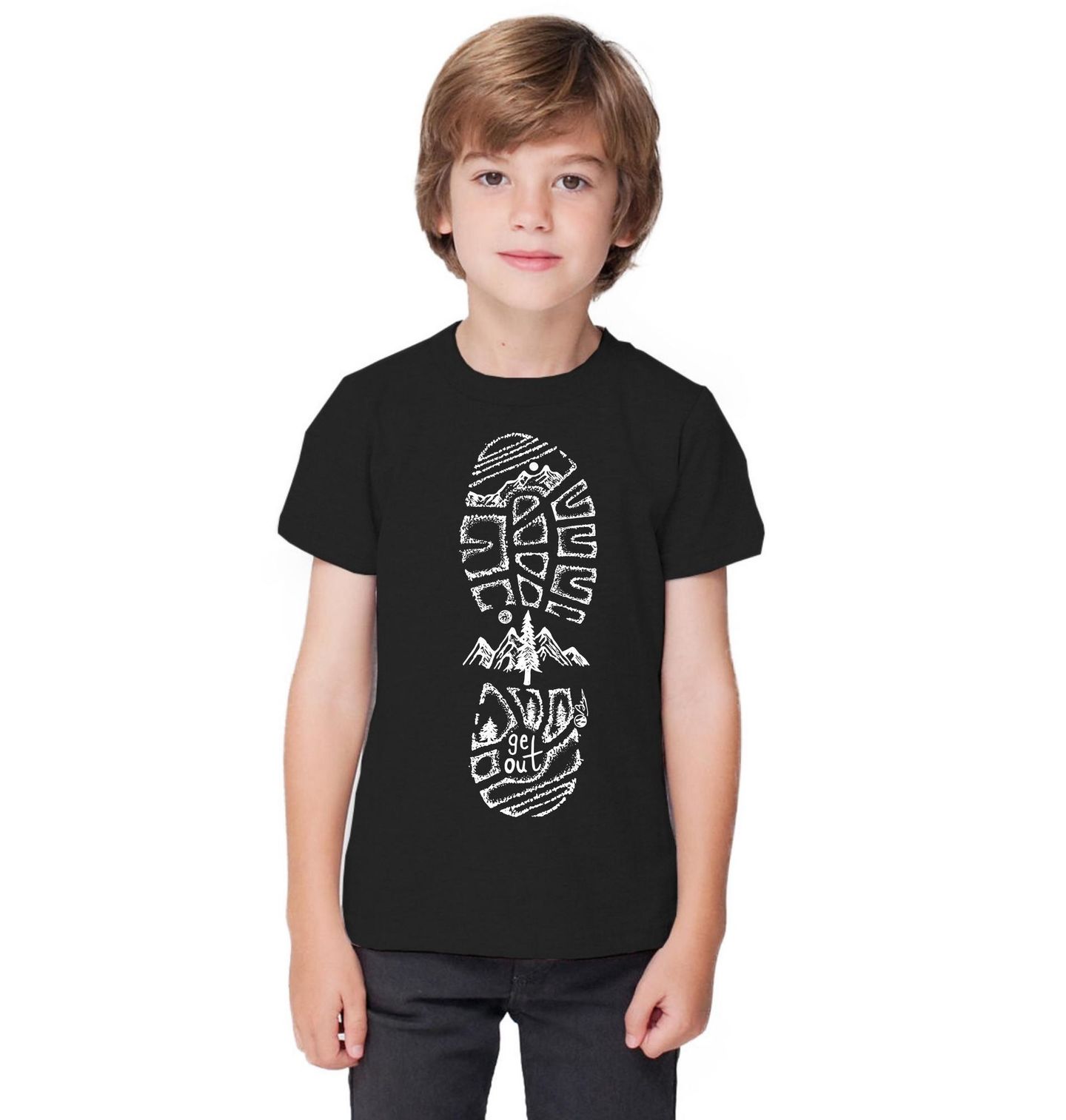 Dětské tričko Otisk boty Vylez ven! Get Out. Vtipný a kreativní motiv – podrážka turistické boty s celým světem uvnitř. Hory, stromy, oheň, hiking, camping a výzva Get Out čekají na každého, kdo má duši dobrodruha.