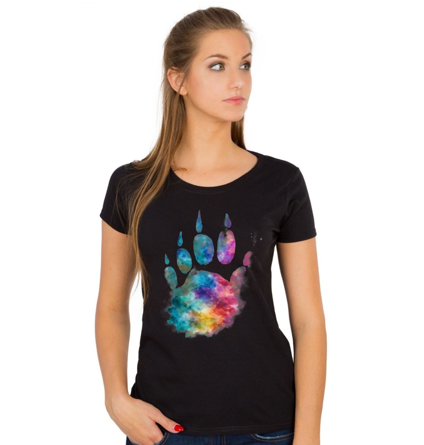 Dámské tričko Otisk Tlapy Medvěda. Duhová tlapka v sobě nese výrazný otisk medvěda – krále lesů, zvířete, které zanechává stopu nejen v divočině, ale i v srdci každého, kdo si váží svobody. Unikátní barevné zpracování dává motivu moderní nádech, díky kterému se tričko hodí jak na festival, do města, tak i na horskou túru. Pro všechny, kdo jdou vlastní cestou a nebojí se zanechat stopu.