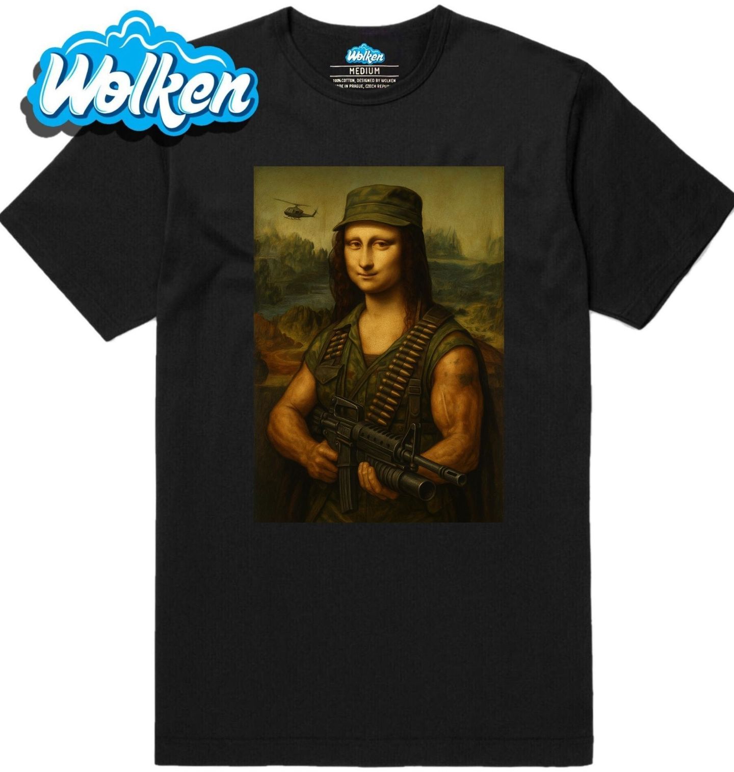 Pánské tričko Ozbrojená Mona Lisa ve Službě. Tahle odvážná a vtipná parodie na slavný obraz tě nenechá chladným. Mona Lisa se zde mění v neohroženou bojovnici se samopalem a municí přes rameno. Motiv kombinuje umění, humor a akční atmosféru, takže je ideální pro fanoušky originálních potisků, kteří mají rádi nadsázku i zbraně.